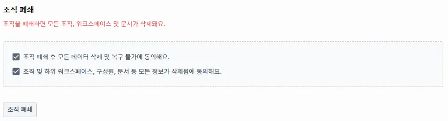 ※ 조직을 폐쇄하면 조직에서 사용중이던 문서와 모든 데이터, 하위 워크스페이스가 모두 삭제되고 복구가 불가능해 지니 충분히 검토 후 조직 폐쇄를 진행해야 합니다.