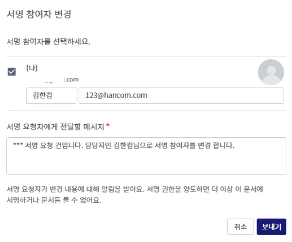서명 요청자에게 메시지와 함께 [서명 참여자 변경 요청]을 할 수 있습니다.
