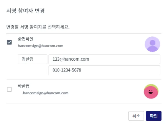 변경할 서명 참여자를 선택하고 변경할 참여자의 정보를 입력 한 후 [확인] 버튼을 누르면 서명 참여자가 변경 됩니다.