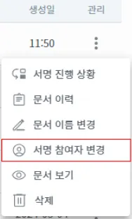 [문서함]에서 서명 참여자를 변경할 서명의 [관리]의 [서명 참여자 변경] 메뉴를 실행 합니다.