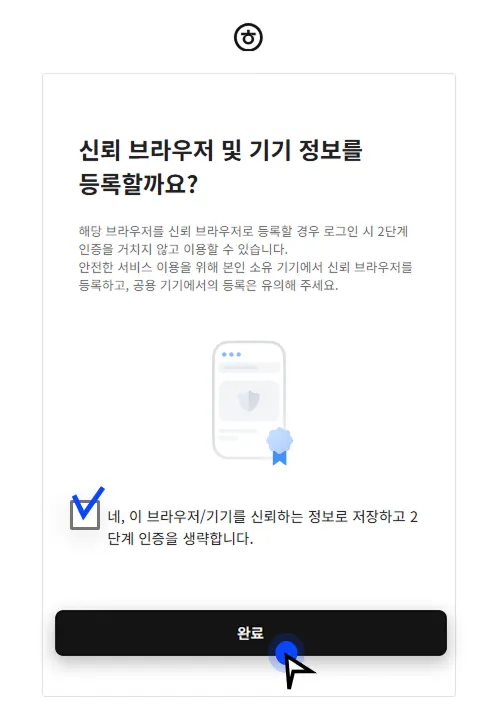 2단계 인증 완료 > 신뢰 브라저 및 기기 정보를 등록하는 페이지로 이동 > ‘네, 이 브라우저/기기를 신뢰하는 정보로 저장하고2단계 인증을 생략합니다.’ 체크 후 [완료] 클릭