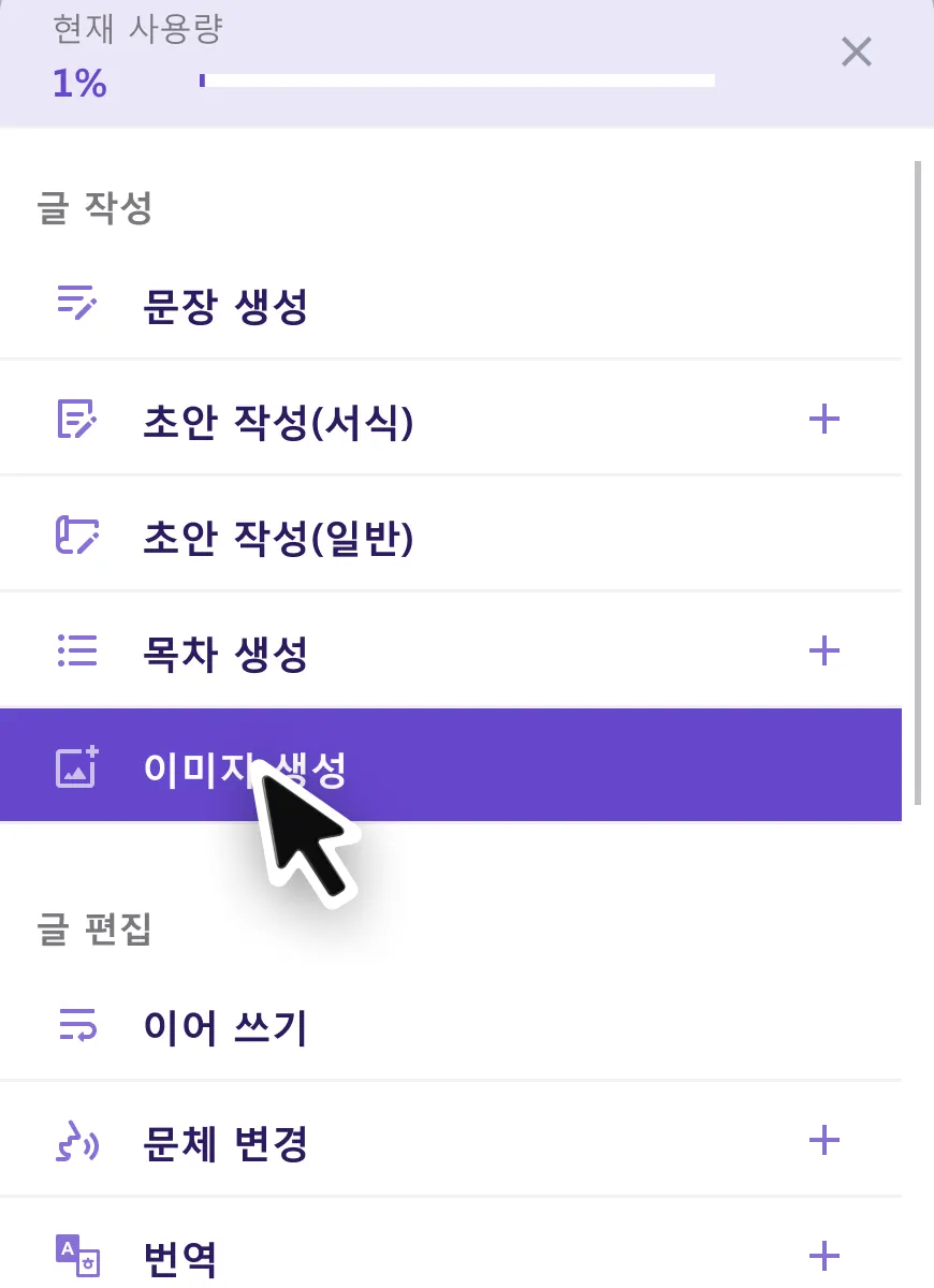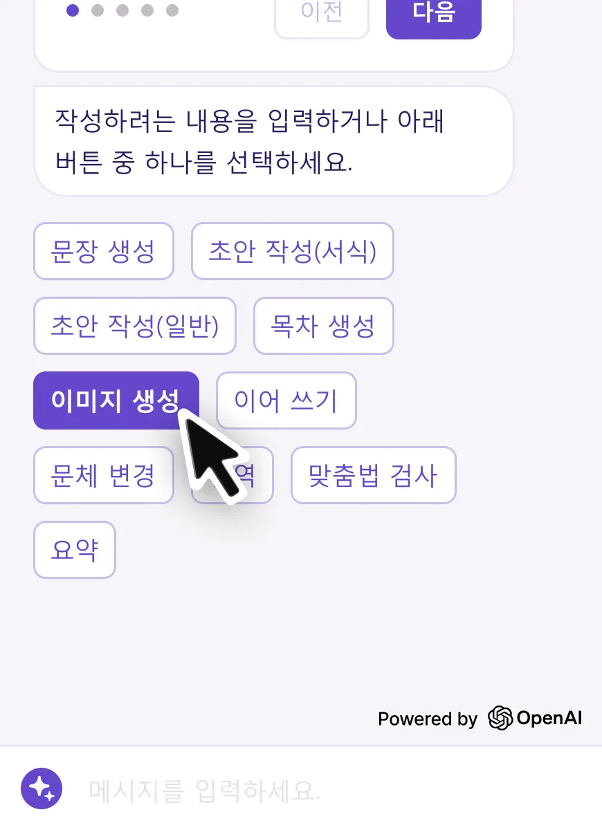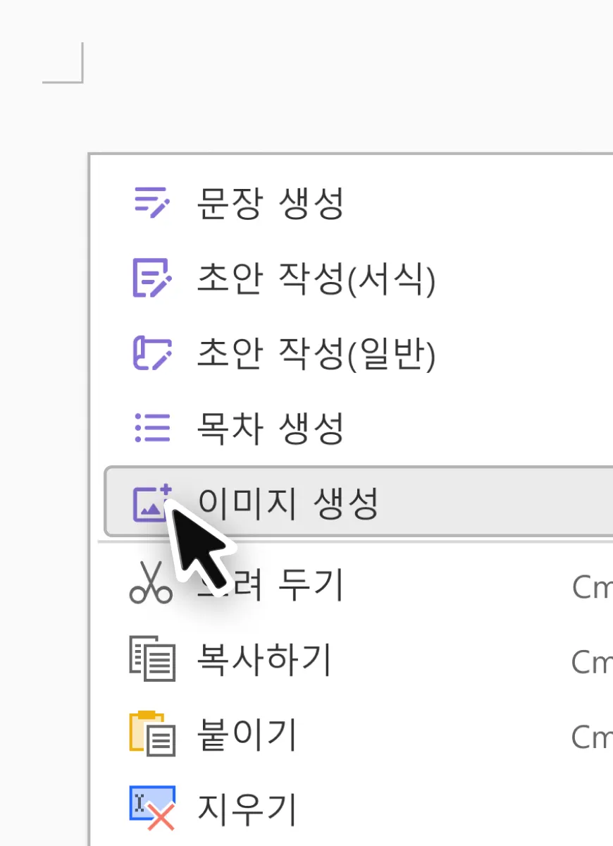 아래 3가지 방법으로 한컴독스 AI를 이용해 이미지 생성 기능을 이용할 수 있습니다.