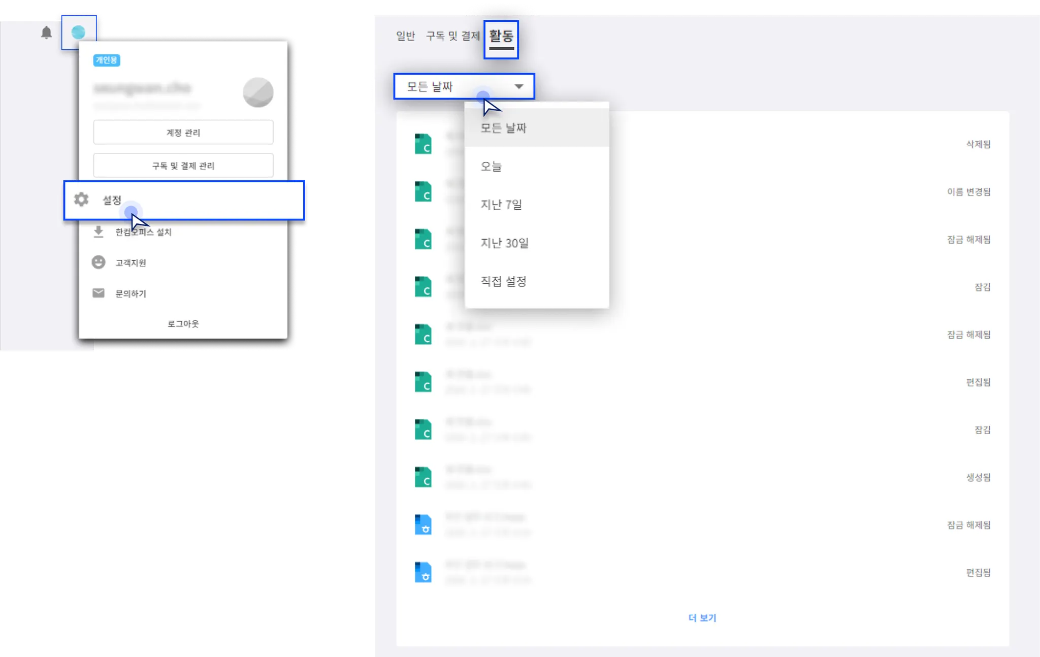 프로필 메뉴 > 설정 > 활동 클릭 후, 기간별로 문서 작성한 내역 확인 할 수 있습니다.