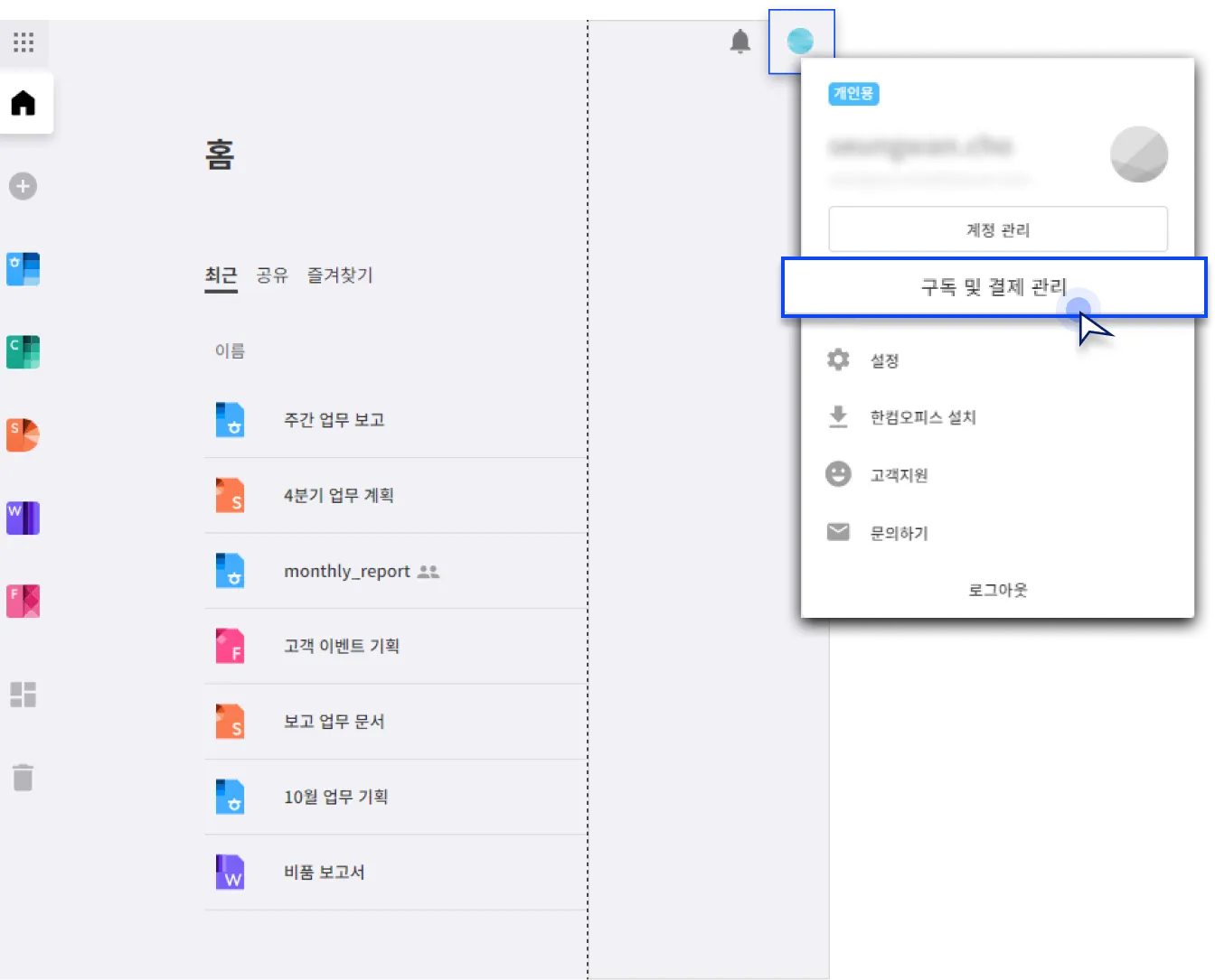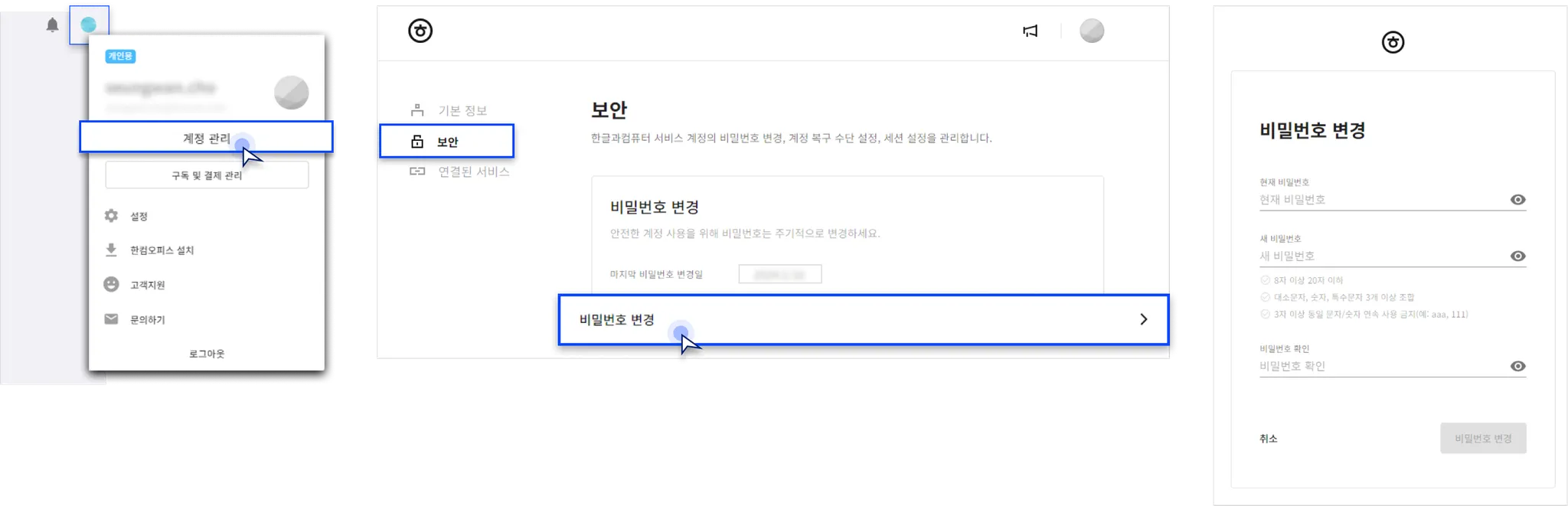 한컴독스 비밀번호 변경은 프로필메뉴 클릭한 후, 계정 관리 > 보안에서 변경할 수 있습니다.