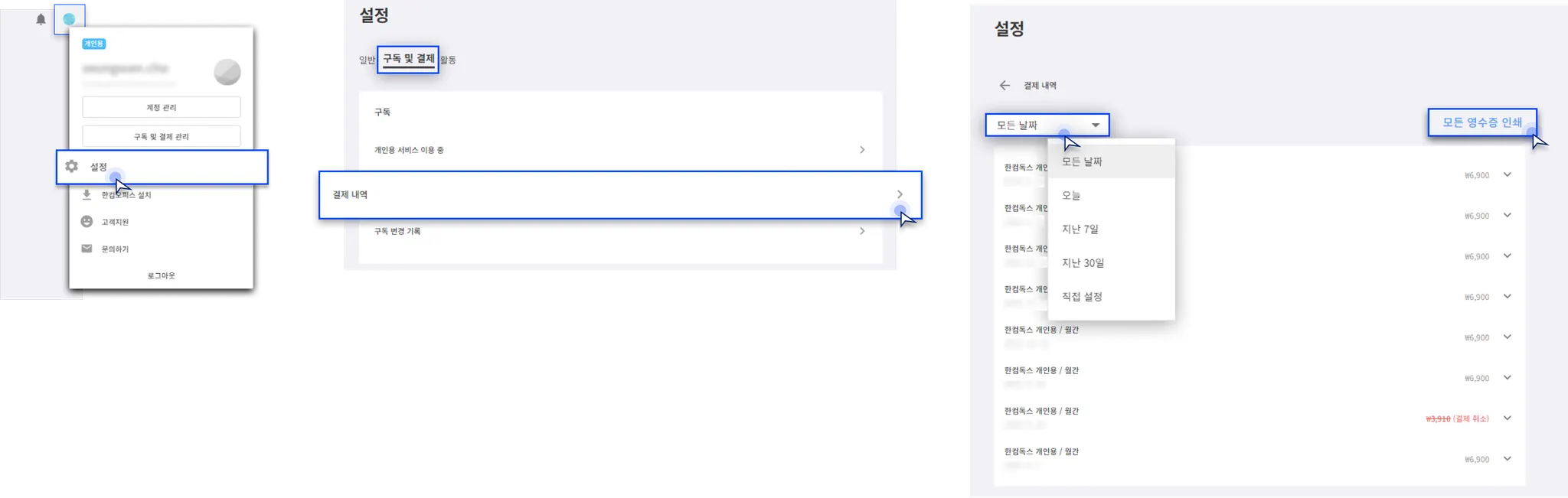 ‘기간’을 설정한 후, 해당되는 결제 내역을 클릭하고 '영수증' 클릭 후 인쇄