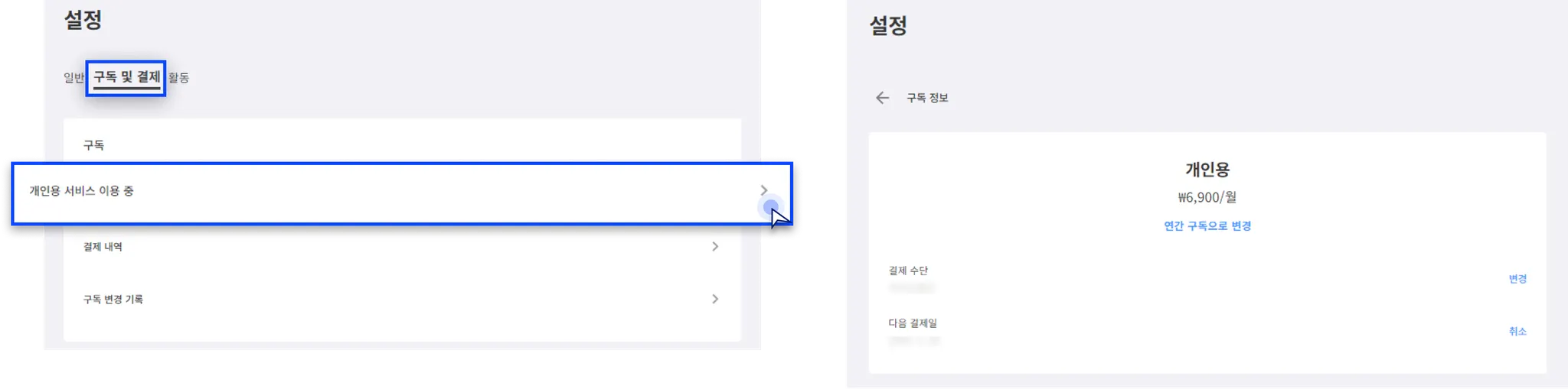 구독 정보에서는 월간 <> 연간 구독 변경, 결제 수단 변경, 결제일 취소가 가능합니다.