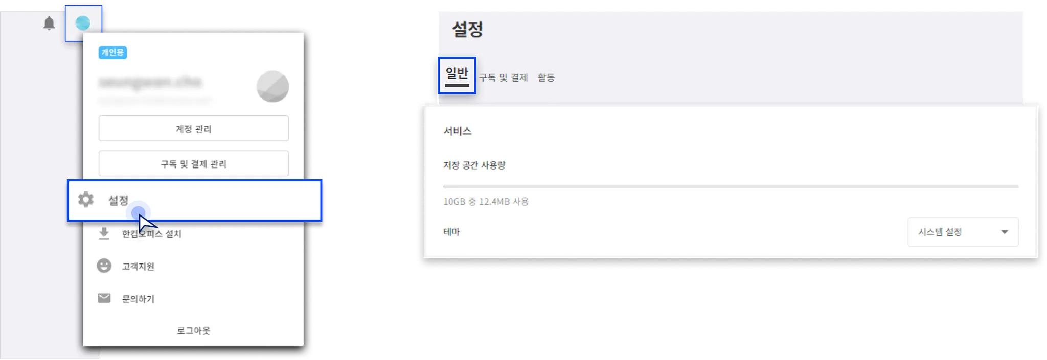 저장 공간은 프로필 메뉴 > 설정 > 일반에서 확인 가능합니다.