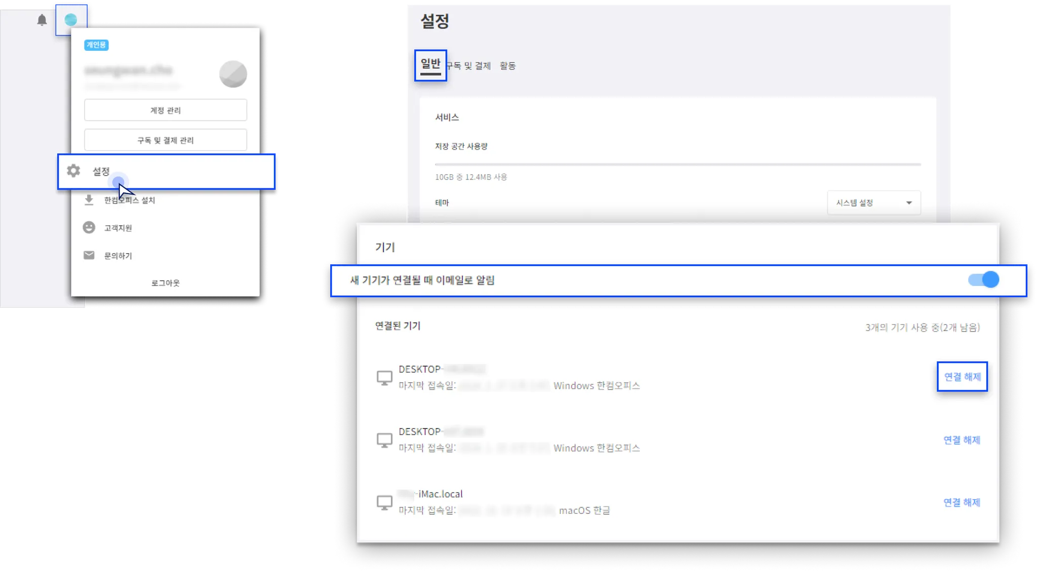 새 기기가 연결될 때 이메일 알림 설정 및 연결된 기기 연결 해제가 가능합니다.