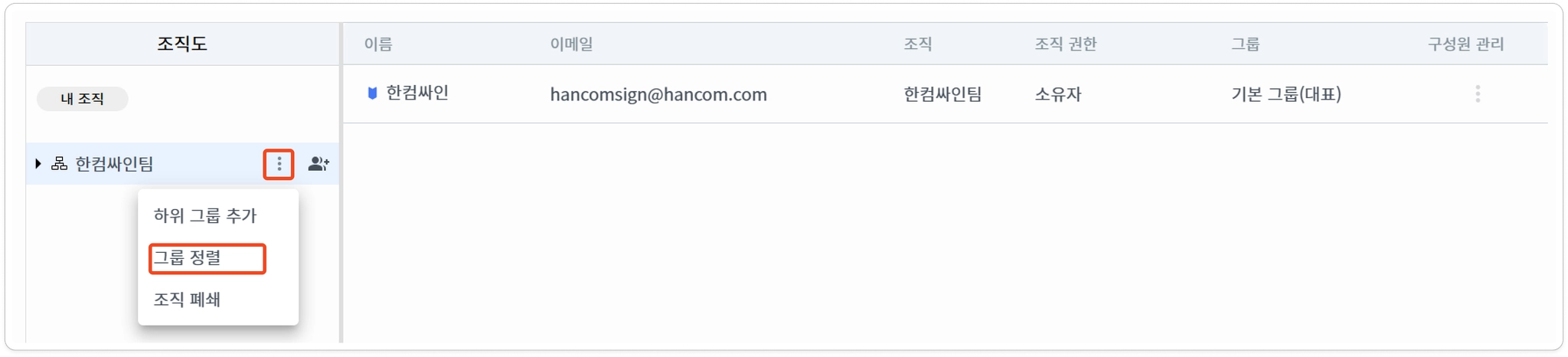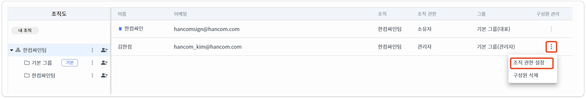 조직직명 우측에 있는 ⋮ (관리 아이콘)을 선택하면 권한별로 가능한 기능이 노출됩니다.