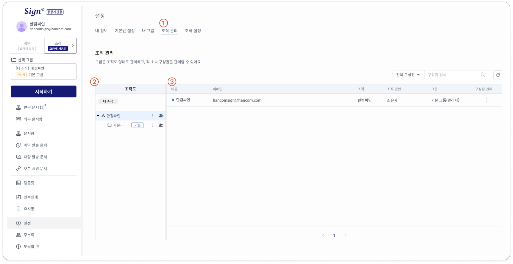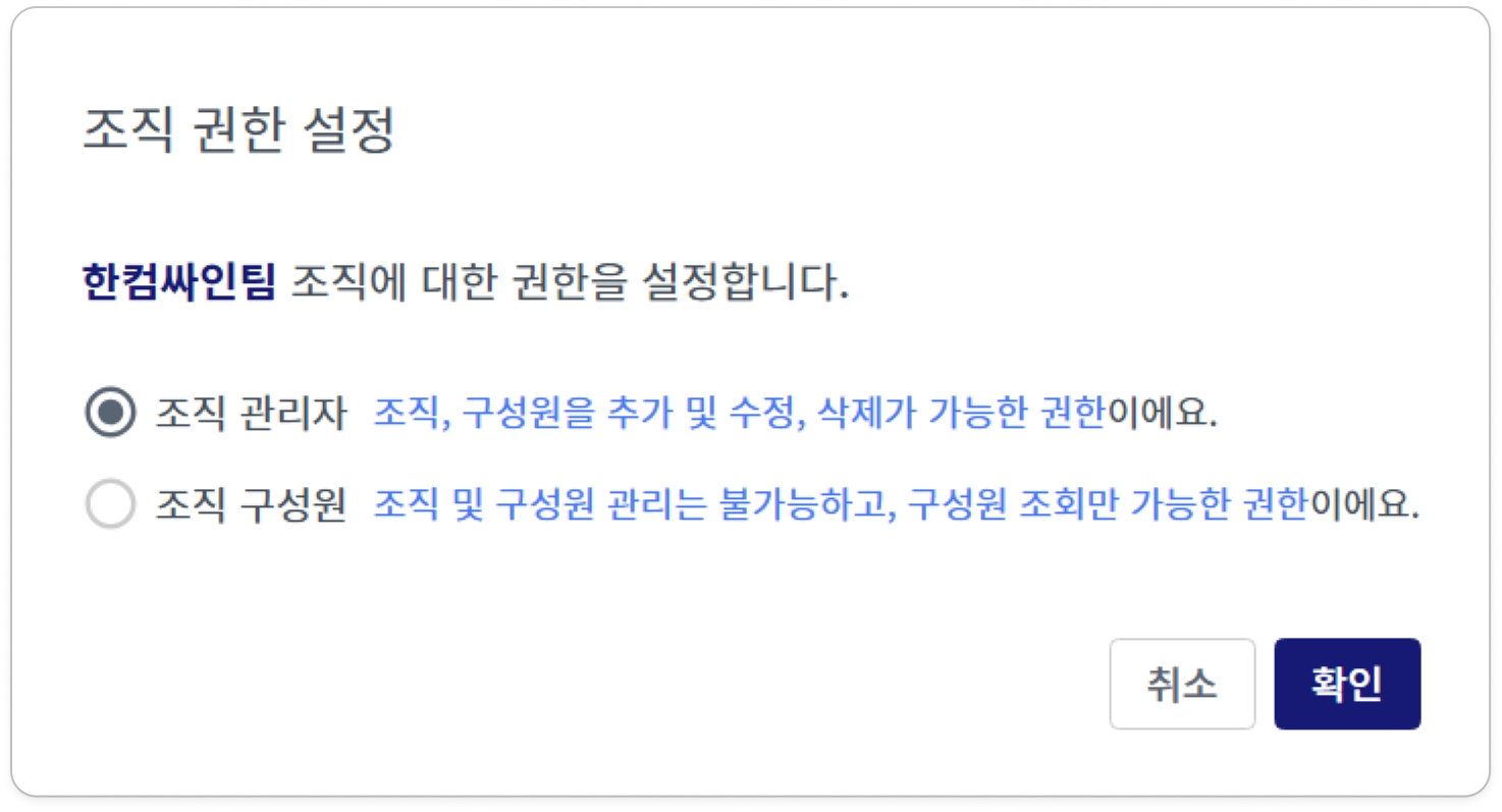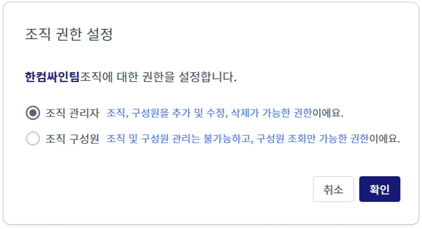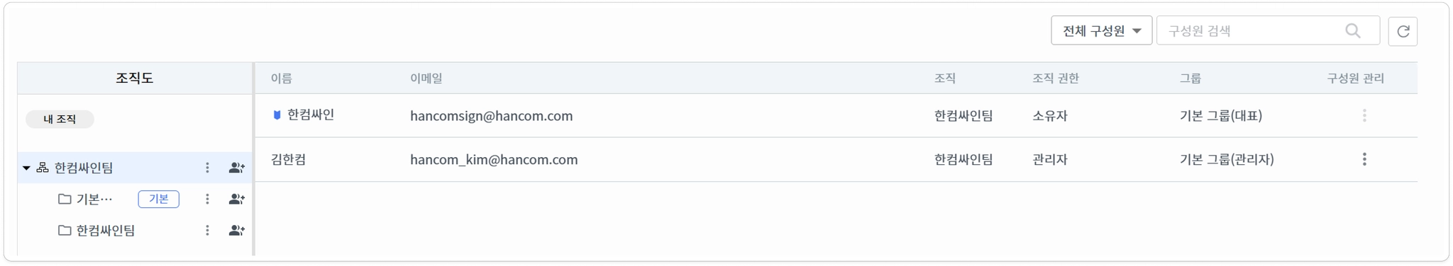 조직 권한 | 조직 소유자 (기존과 동일) | • 한컴싸인의 요금제를 결제하고 최초 조직을 생성/폐쇄하는 담당자