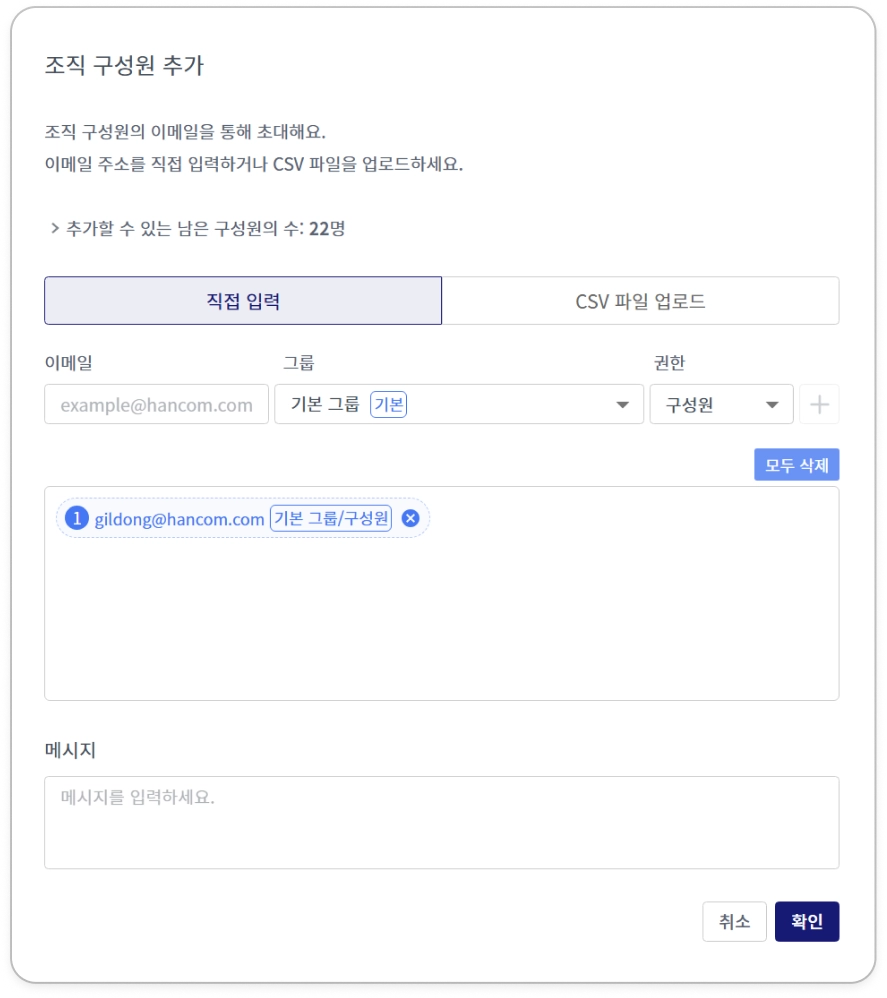 구성원 추가는 직접입력 또는 CSV 등록 가능합니다.
