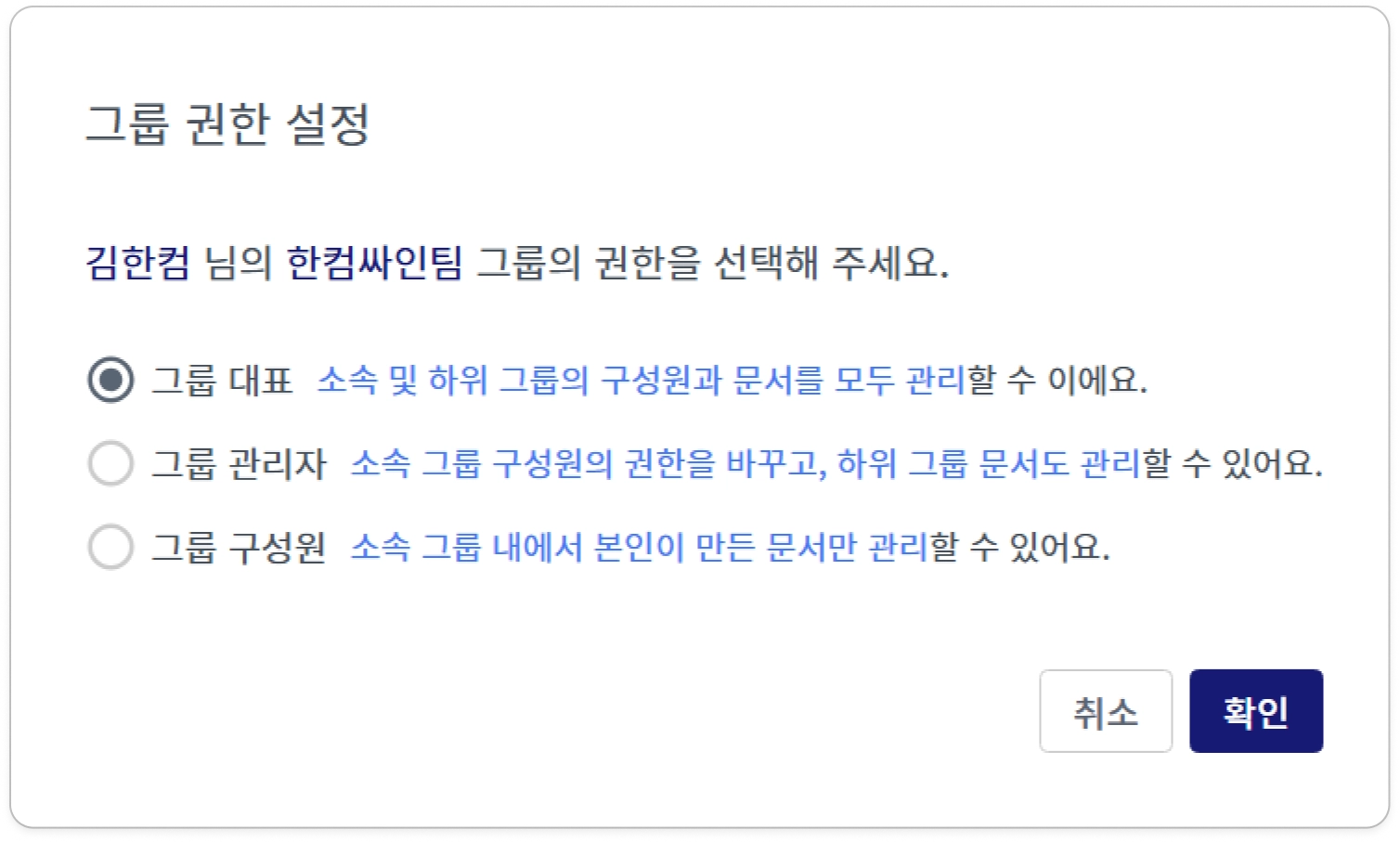 그룹 권한: 각 그룹의 문서에 대한 접근 및 관리할 수 있는 권한입니다.