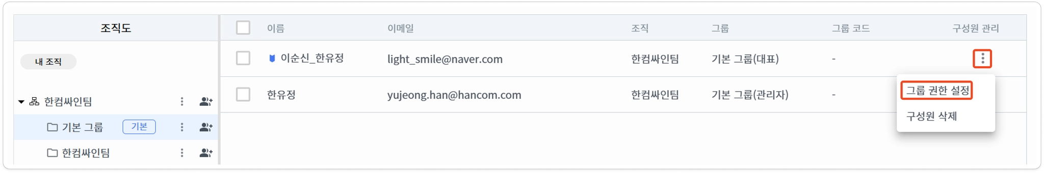 그룹명을 선택한 후 조회되는 구성원 리스트에서 관리 아이콘(⋮)을 선택합니다. 리스트 중 [그룹 권한 설정]을 선택합니다.
