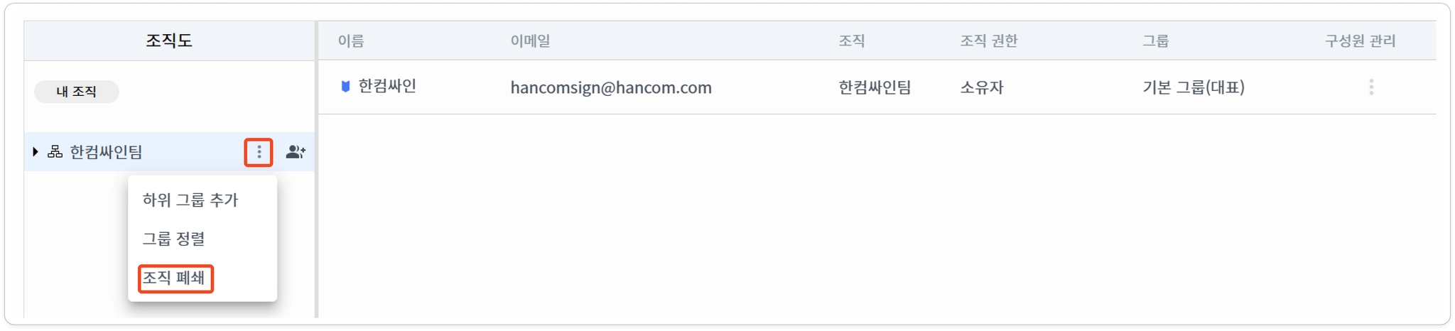 폐쇄할 조직의 관리 아이콘(⋮)을 선택합니다. 노출되는 리스트 중 [조직 페쇄]를 선택합니다.