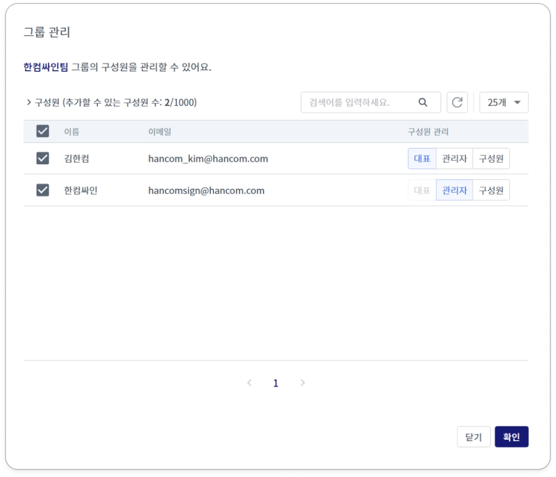 선택이 완료된 후 [확인] 버튼을 누르며, 그룹 내 구성원 배정된 리스트를 확인합니다.