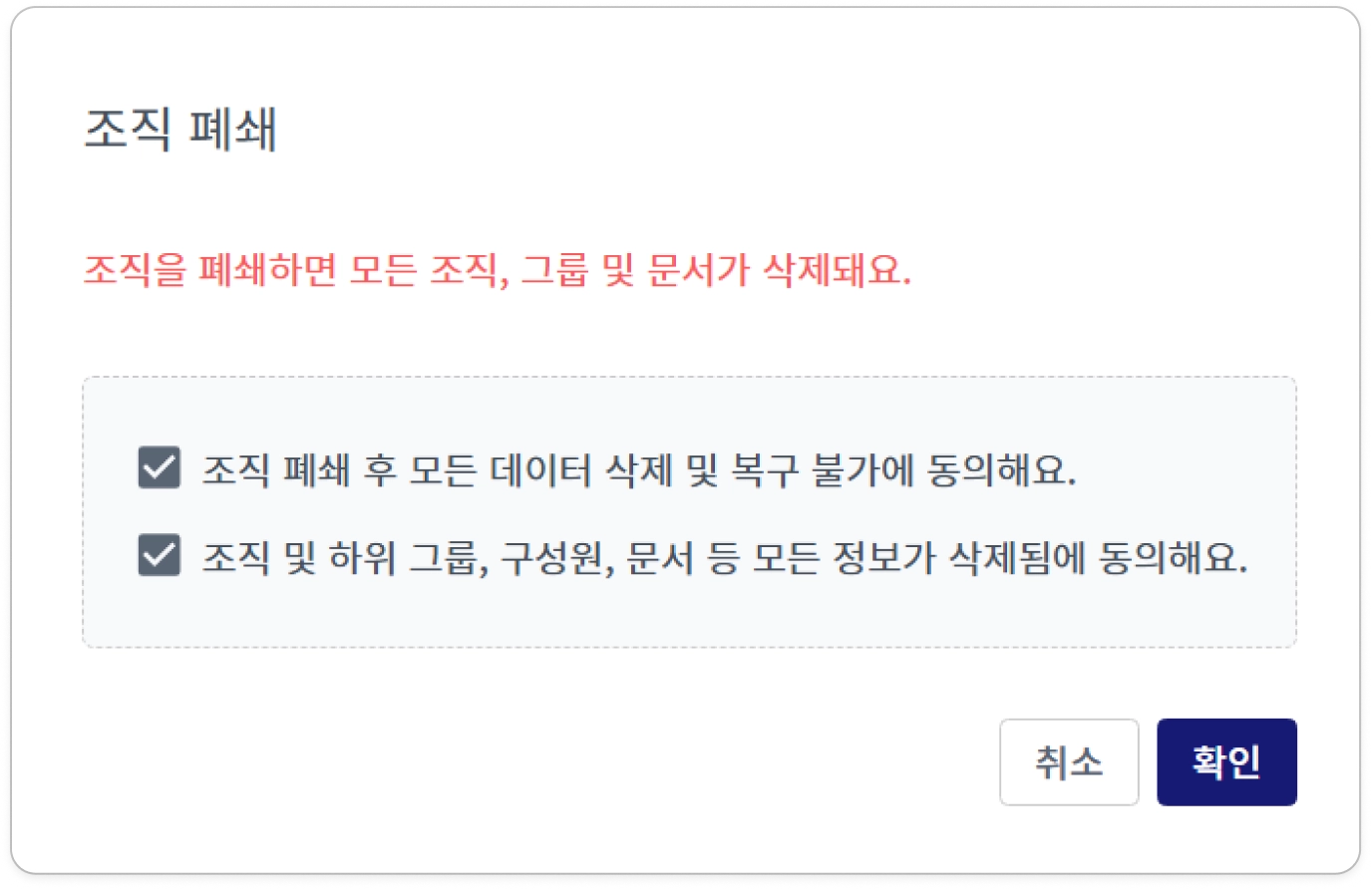 조직 폐쇄에 대한 안내 및 동의 내용에 체크 후 [확인]을 누릅니다.