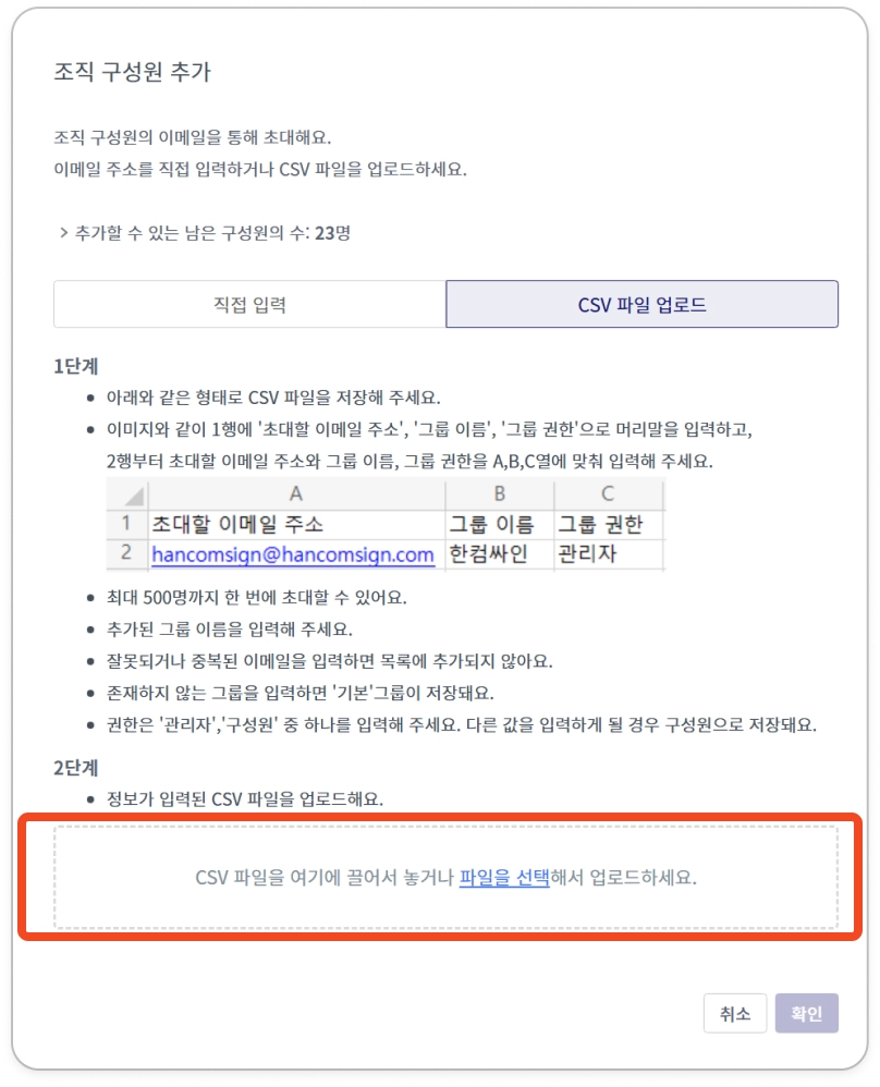 정보가 입력된 CSV 파일을 아래 위치에서 끌어 놓거나 파일을 선택하여 업로드한 다음 [확인]을 누릅니다.