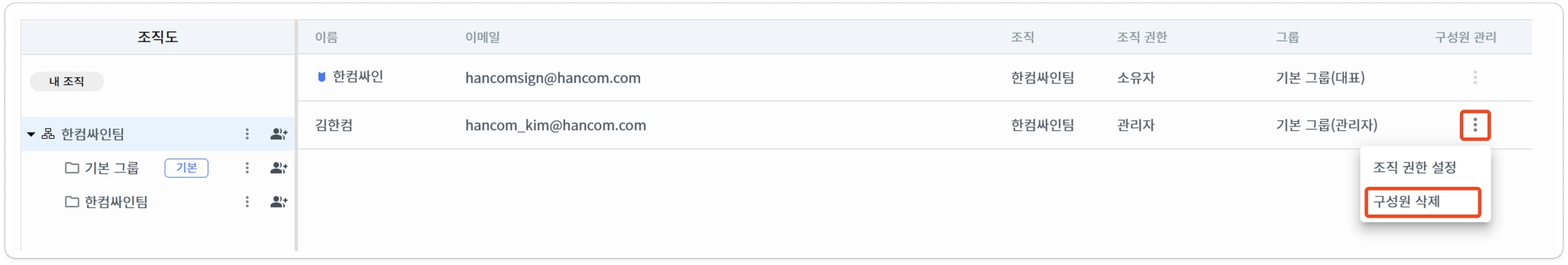 조직에서 구성원을 삭제할 경우, 더 이상 해당 구성원은 조직의 소속이 될 수 없어 그룹에 배정이 불가합니다.