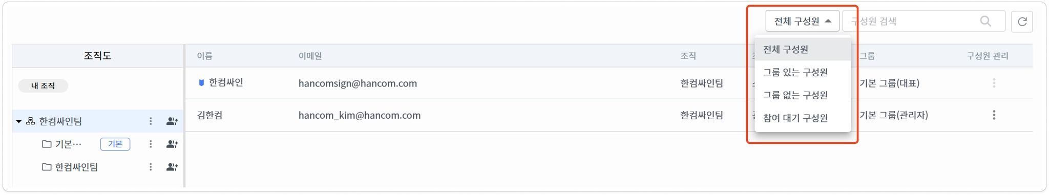 조직 구성원의 경우, 그룹 있는 구성원 / 그룹 없는 구성원 / 참여 대기 구성원을 필터링하여 확인할 수 있습니다.