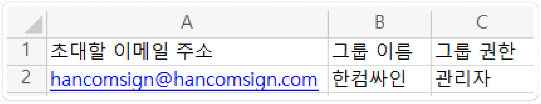 초대할 대상의 정보를 아래 이미지와 같이 1행에 '초대할 이메일 주소', '그룹 이름', '그룹 권한'으로 머리말을 입력하고, 2행부터 초대할 이메일 주소와 그룹 이름, 그룹 권한을 A,B,C열에 맞춰 입력해 주세요.
