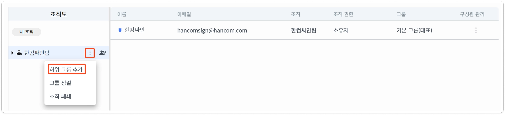 왼쪽 탐색 영역의 [설정 - 조직 관리]에서 그룹을 추가할 조직을 선택하고 관리 아이콘(⋮)을 선택합니다. 노출되는 리스트 중 [하위 그룹 추가]를 선택합니다.