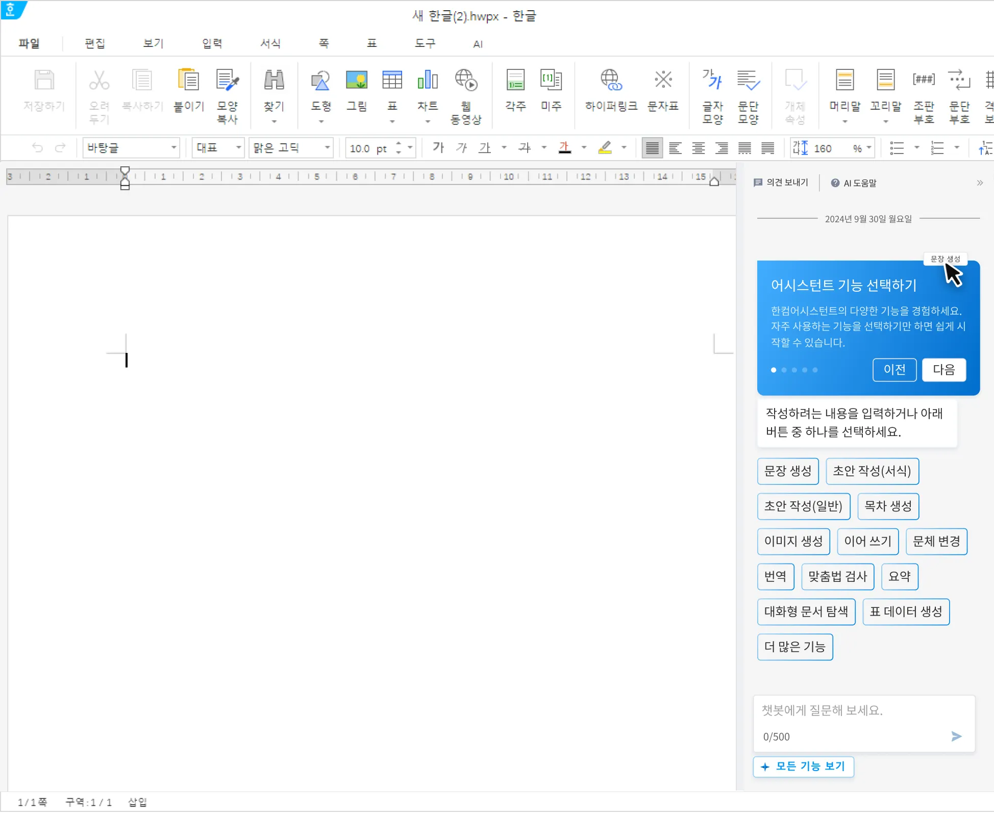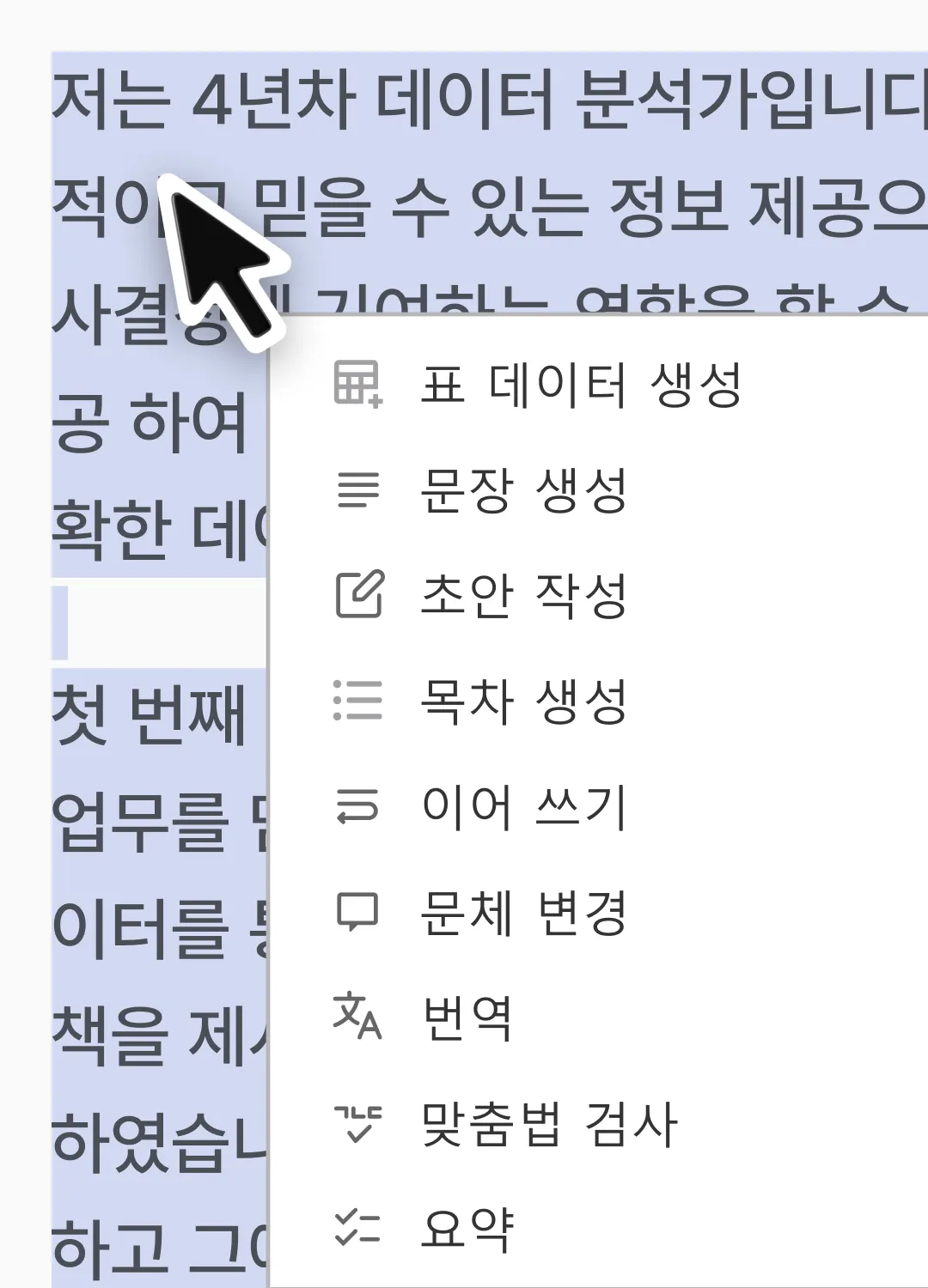 글상자 전체를 선택하면 텍스트를 인식하지 못하여 한컴독스 AI 기능을 적용할 수 없습니다.