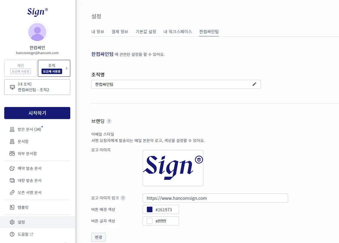 [조직명]을 변경하고 [저장]을 누릅니다.