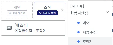 조직 생성과 조직 요금제 구독을 완료하면 내 워크스페이스와 추가된 조직을 선택하여 작업을 진행할 수 있습니다.