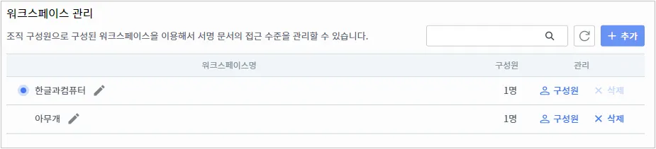 조직 워크스페이스에서는 구성원의 문서나 서명 요청이 조직 소유자에 공유됩니다.