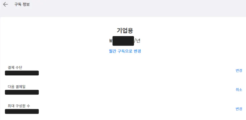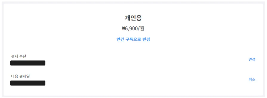 카드 정보는 우측 상단 '마이페이지' > '설정' > '구독 및 결제' > '서비스 이용중' > '결제수단-변경'을 통해 언제든 변경 가능합니다.