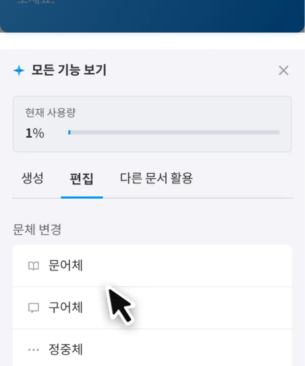 아래 3가지 방법으로 한컴독스 AI를 이용해 문체 변경 기능을 이용할 수 있습니다.