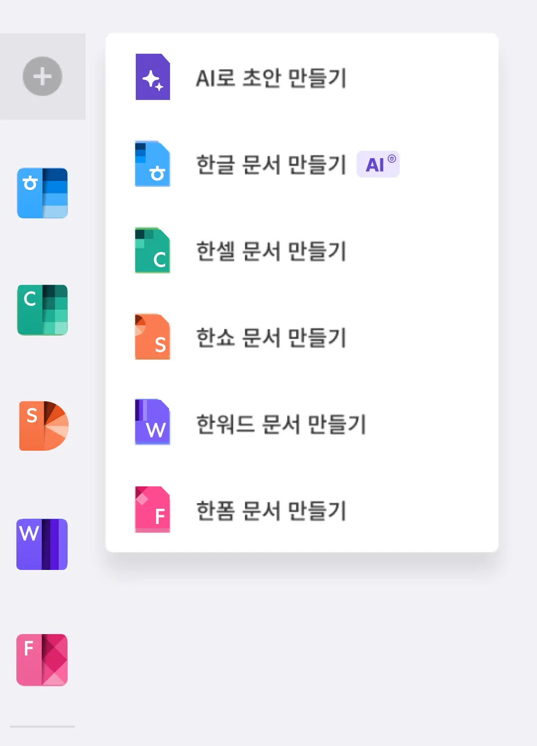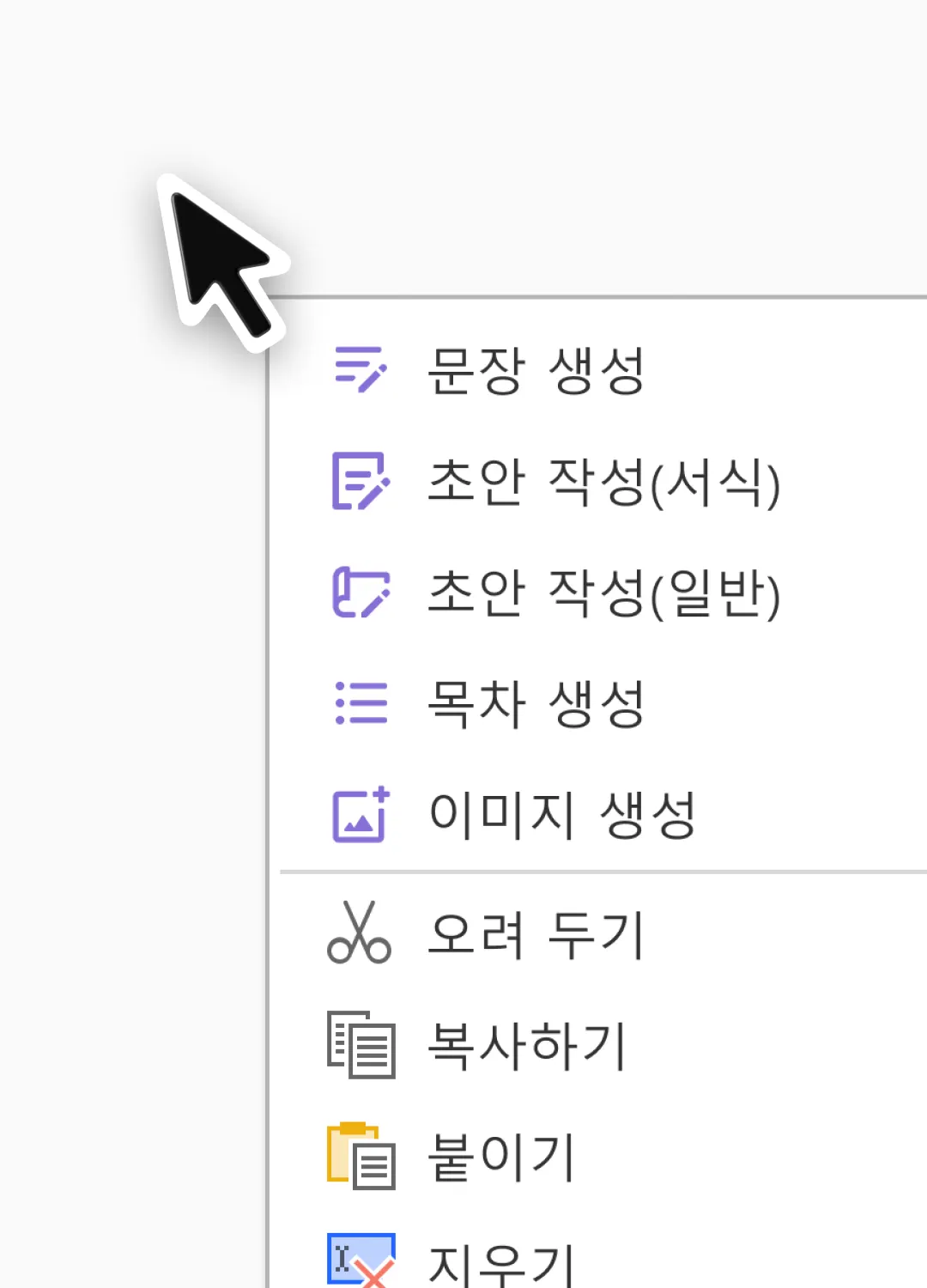 웹 한글에서 4가지 방법으로 AI 기능을 이용할 수 있습니다.