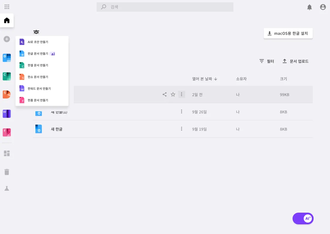 한컴독스 접속 이후 2가지 경로를 통해 한컴독스 AI를 사용할 수 있습니다.
