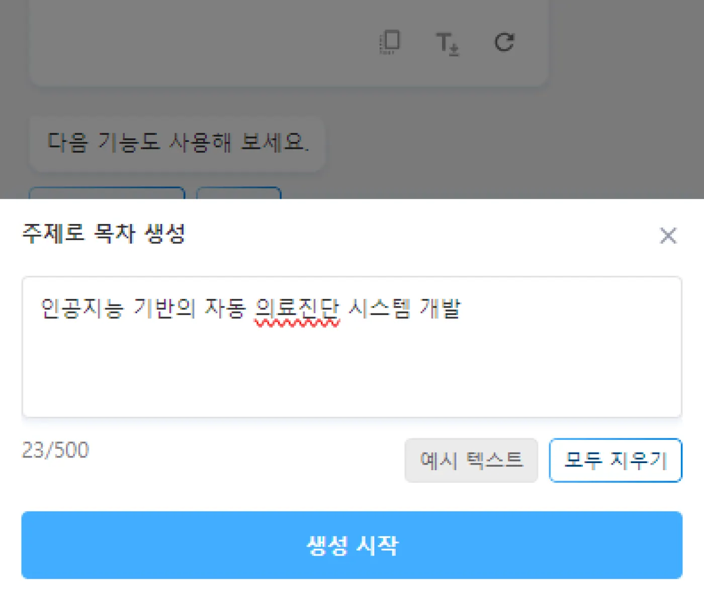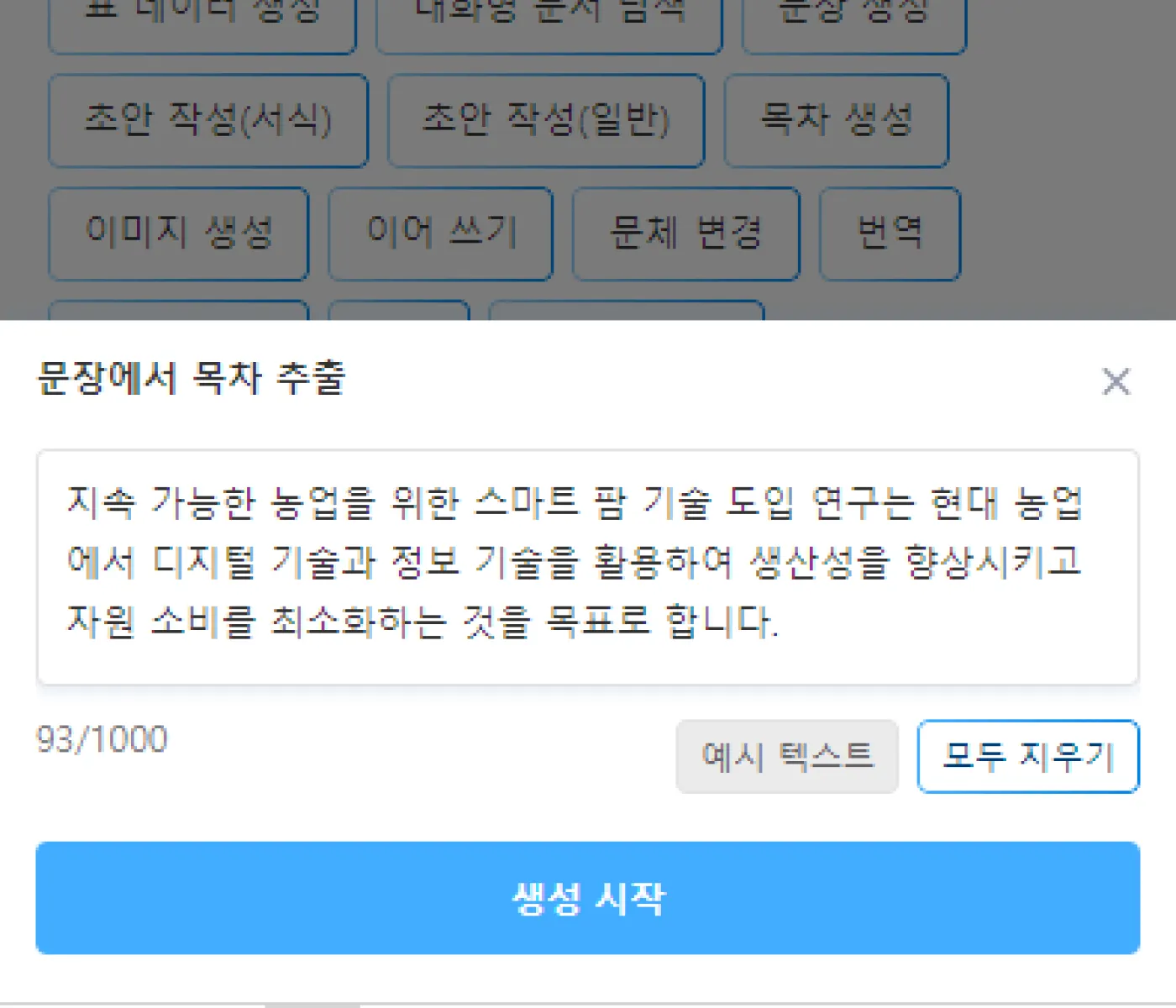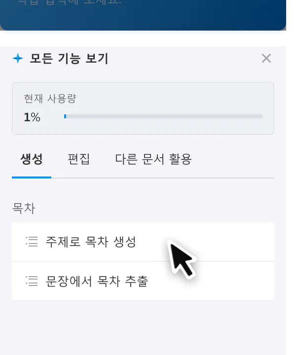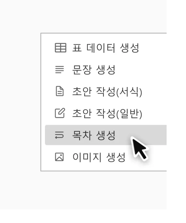 목차 생성 시, 원하는 주제를 문장으로 입력하면 자동으로 목차를 추출합니다.