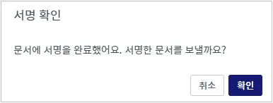 서명이 완료되면 서명한 문서 발송 메시지와 함께 해당 문서가 [받은 문서] 목록에서 삭제되고 [문서함]으로 이동됩니다.