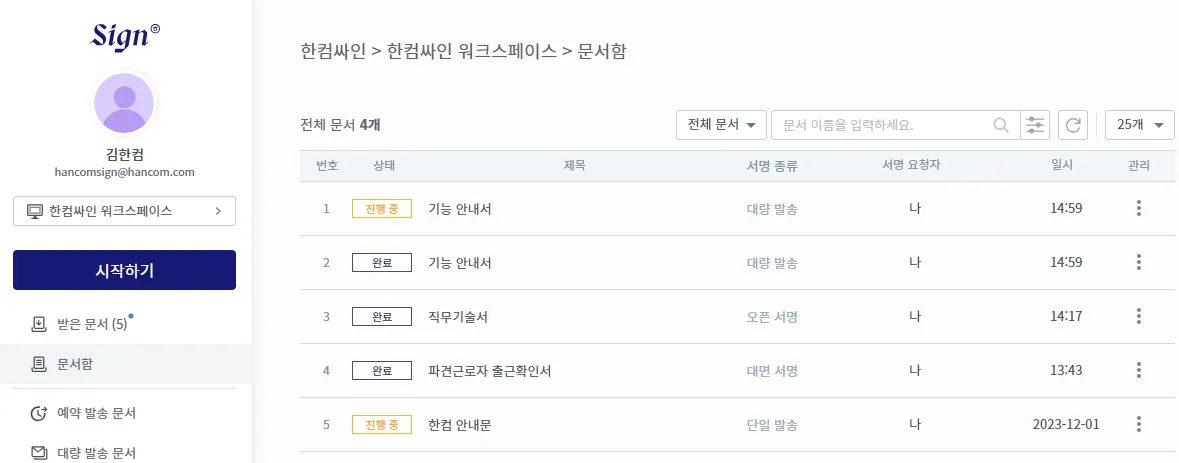 완료된 대면 서명 문서는 대면 서명을 요청한 워크스페이스 문서함에서 확인이 가능 합니다.
