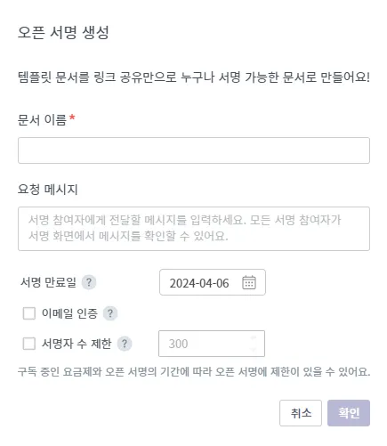※기본값으로 30일 이후 날짜가 설정되어 있습니다. 지정된 만료일이 지나면 해당 오픈 서명 링크는 비활성화 됩니다.