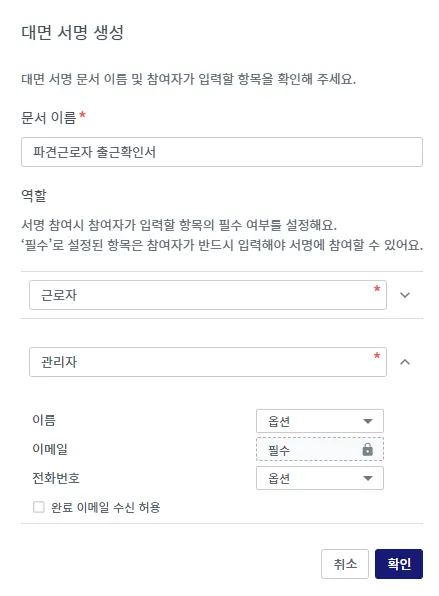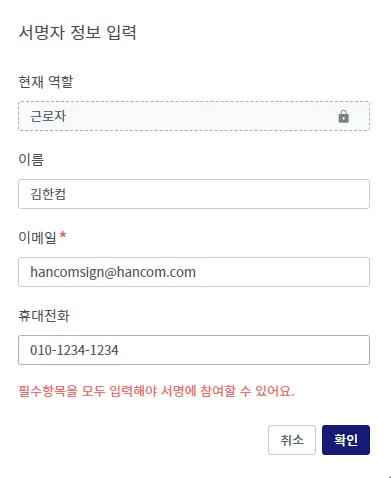 ‘역할’의 ‘이름’, ‘이메일’, ;전화번호’ 항목은 서명 시작 전 서명 참여자가 각각 자신의 정보를 입력 한후 서명을 진행 합니다.