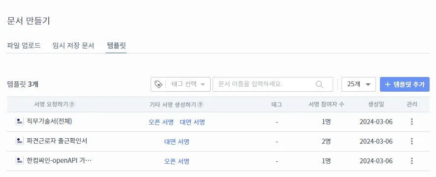 ※대면 서명을 생성 하려면 ‘서명 순서 지정하기’가 설정된 템플릿 문서가 필요해요.