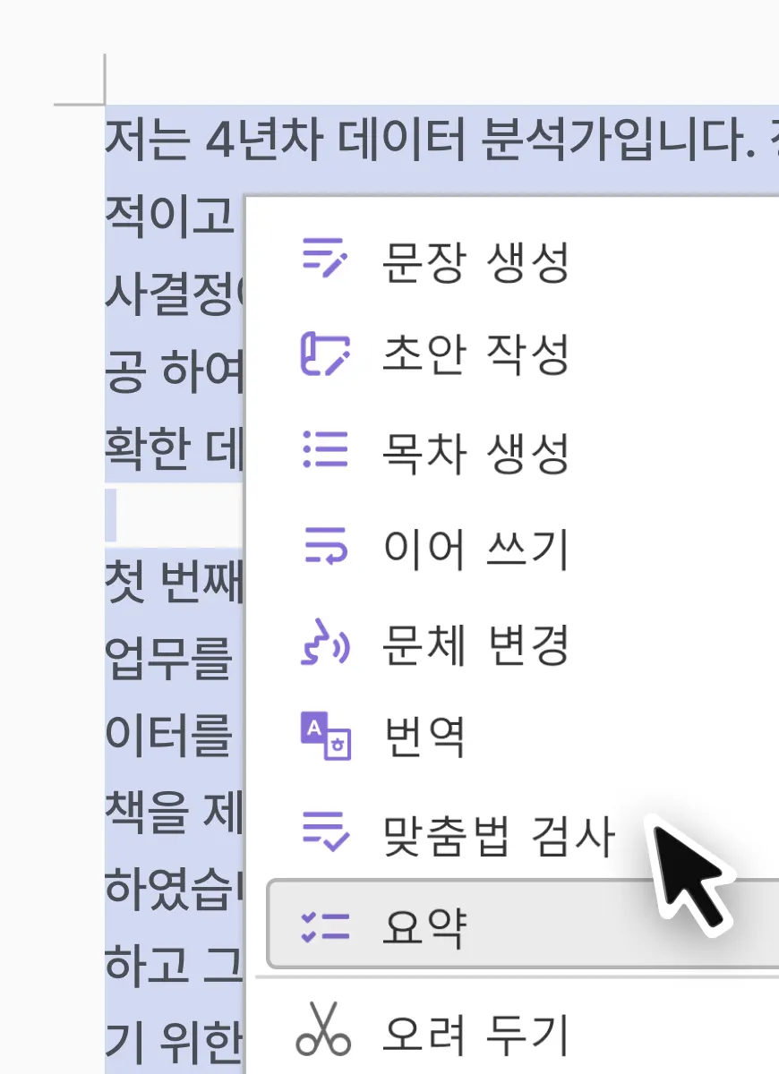 아래 4가지 방법으로 한컴독스 AI를 이용해 요약 기능을 이용할 수 있습니다.