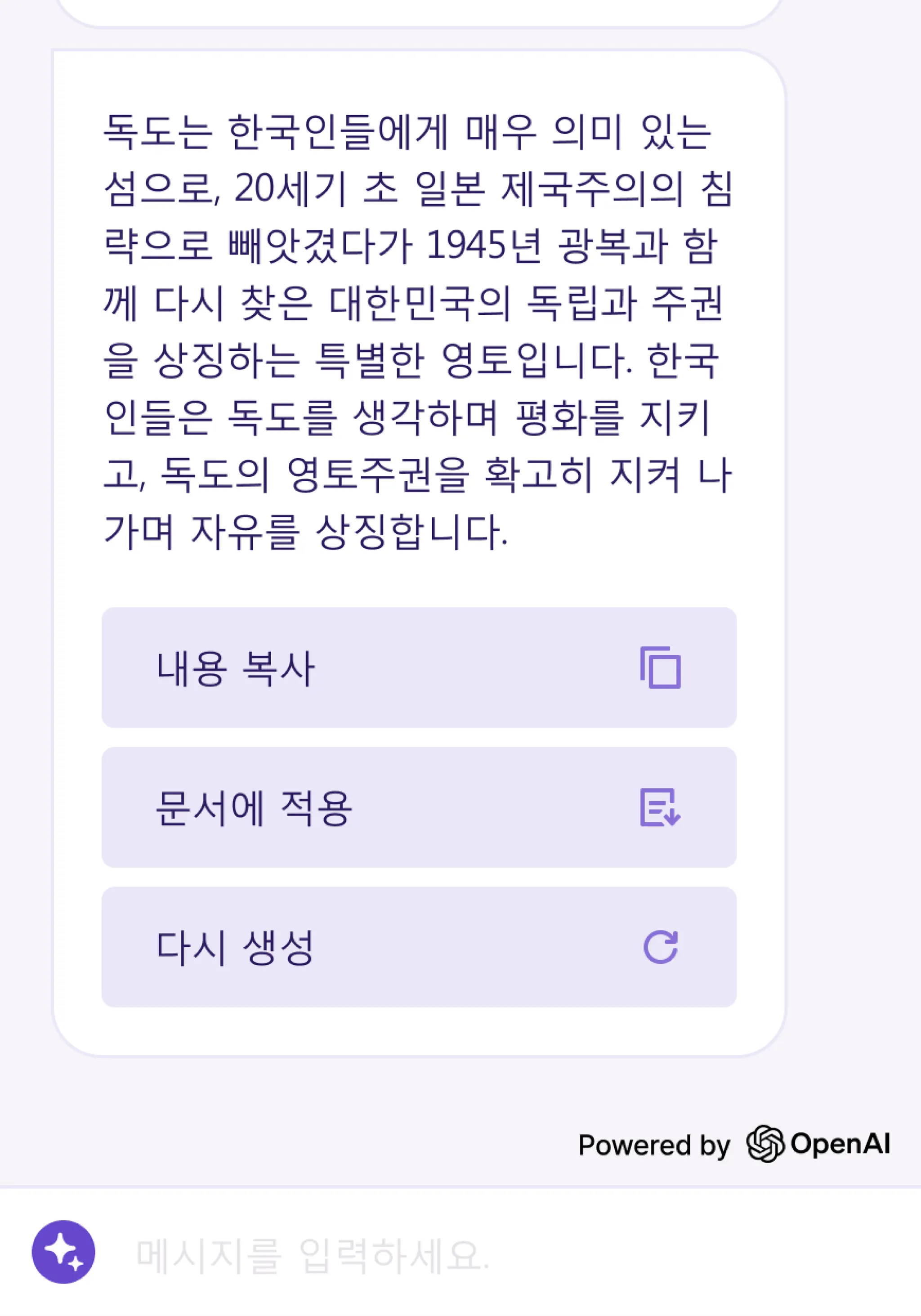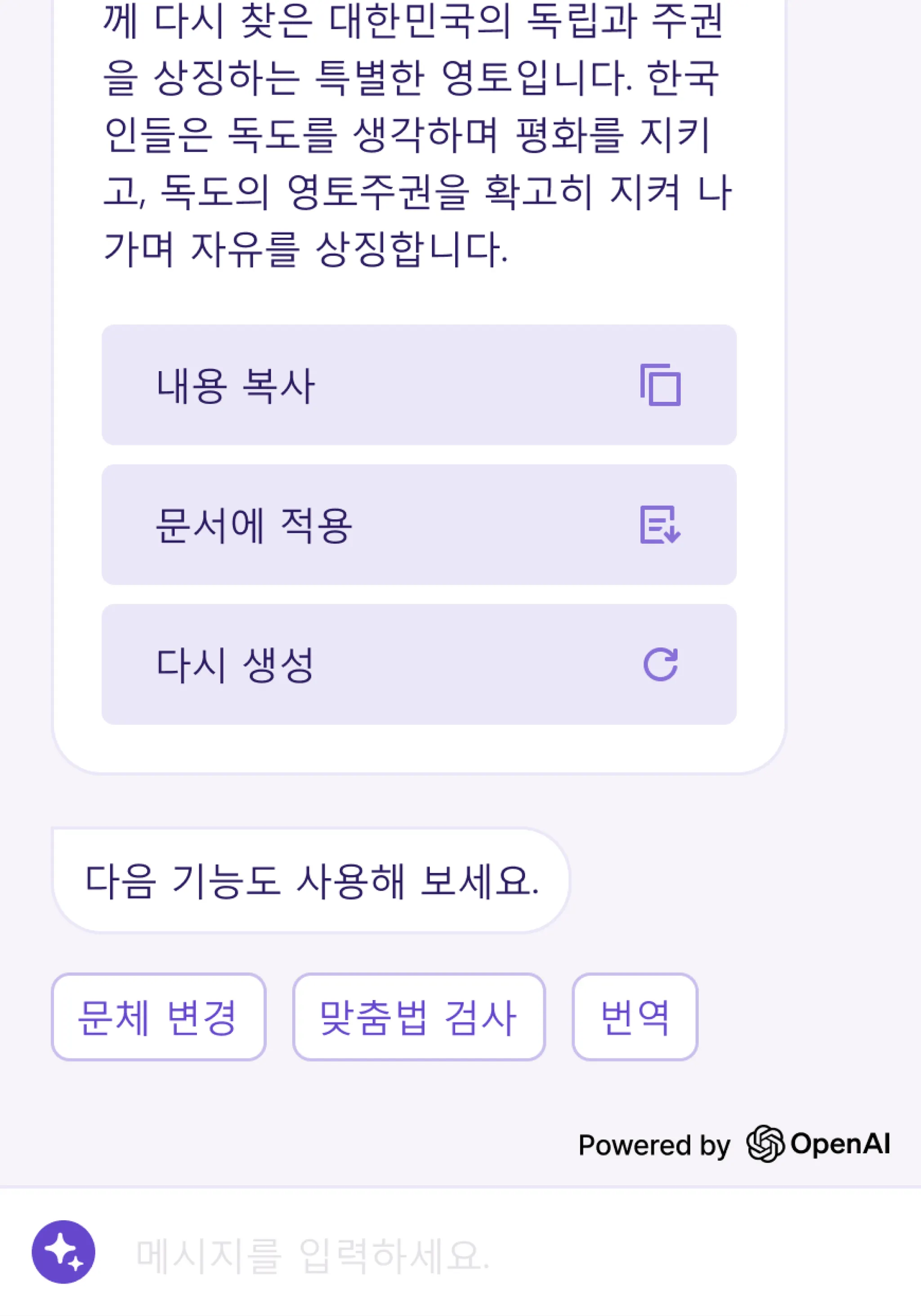 생성된 문장에 대해 내용 복사/문서에 적용하기/다시 생성하기가 가능합니다.