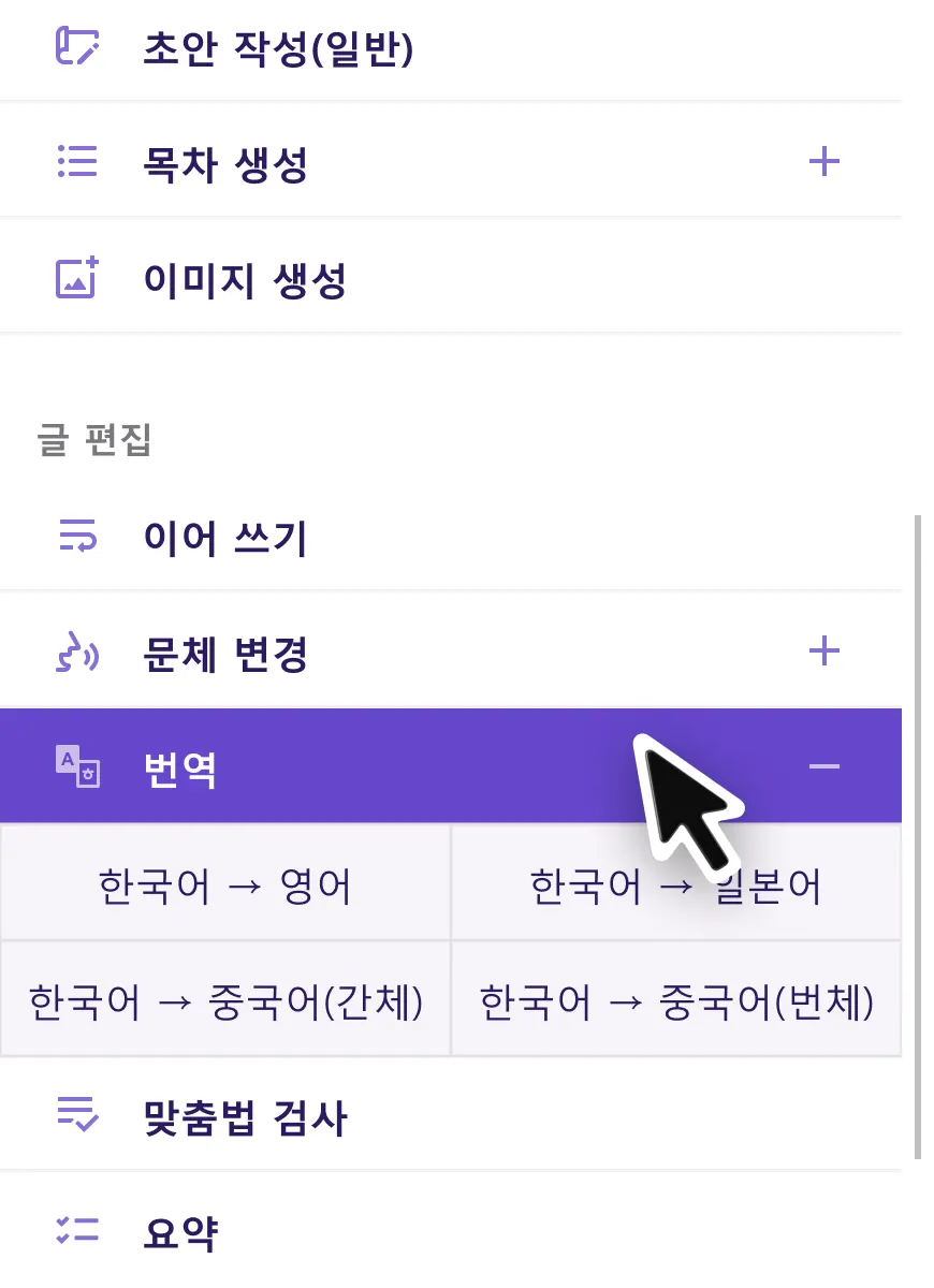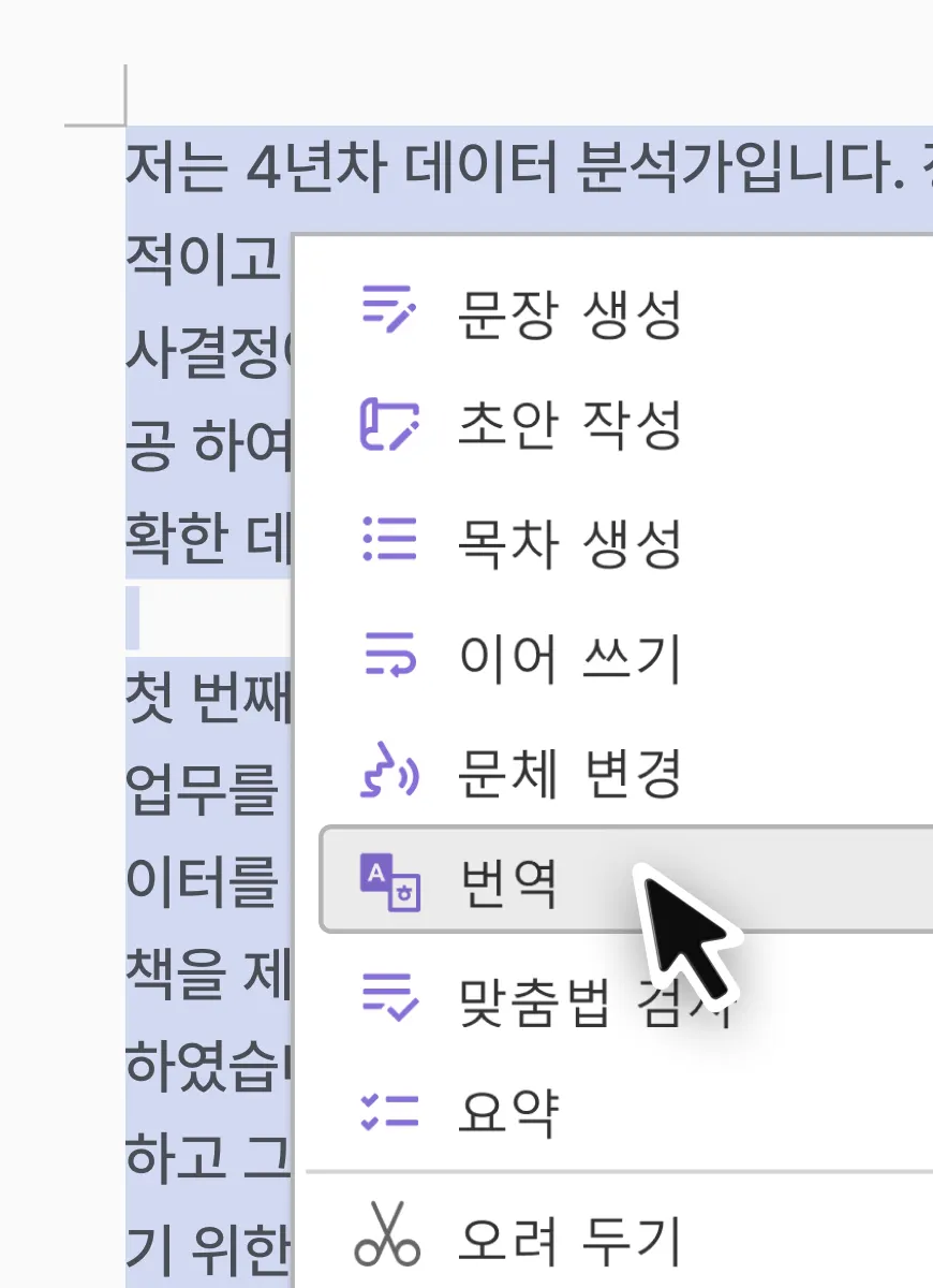아래 3가지 방법으로 한컴독스 AI를 이용해 번역 기능을 이용할 수 있습니다.