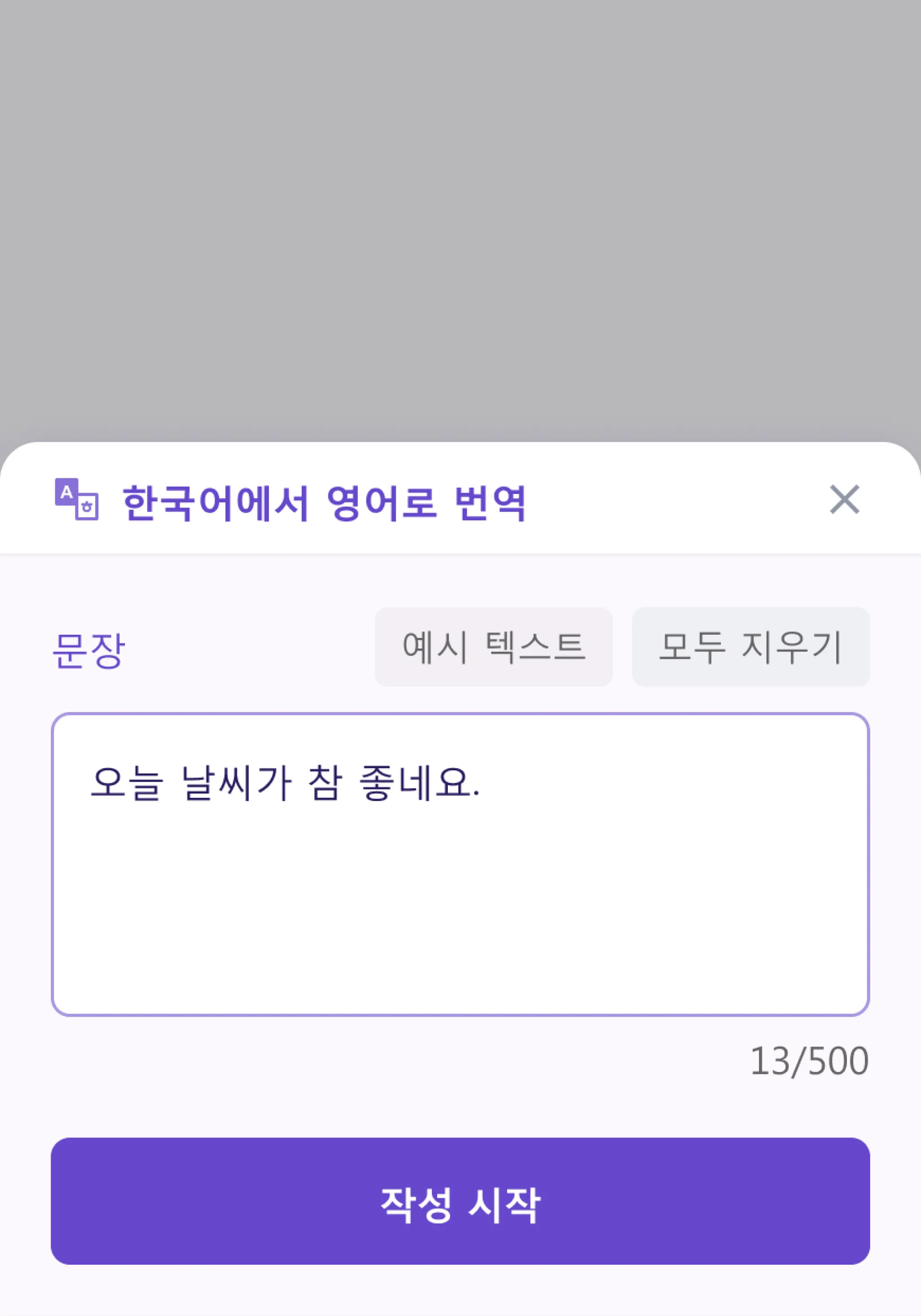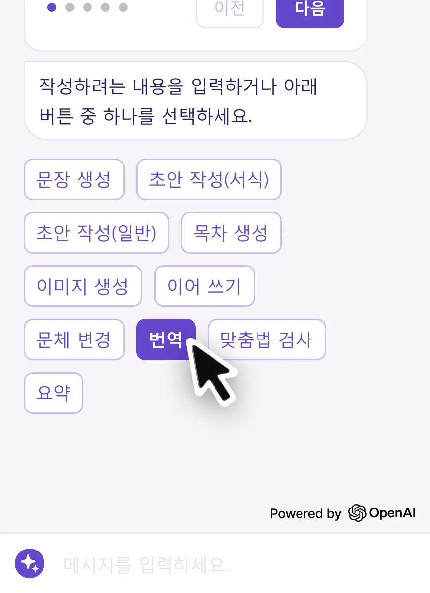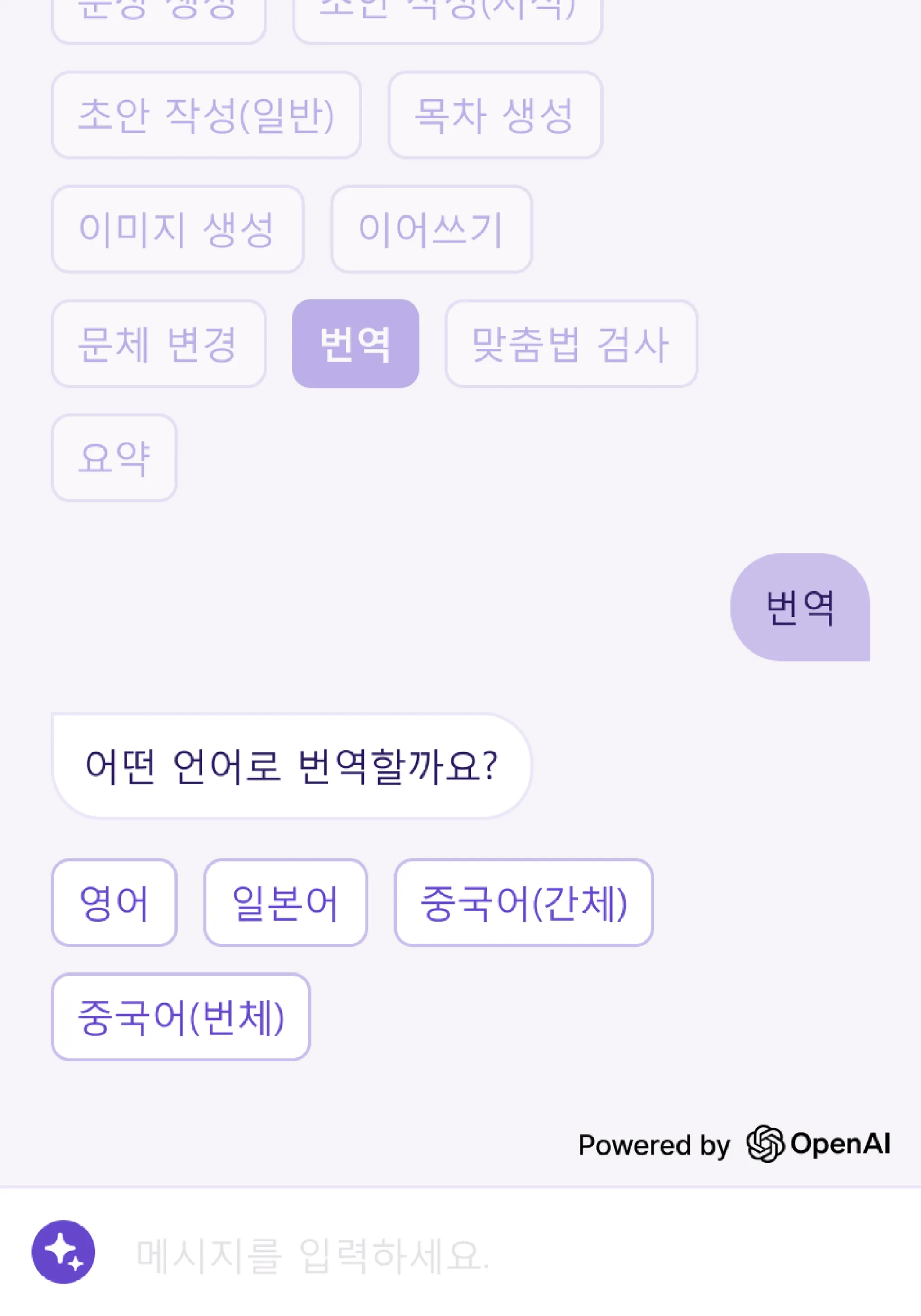 번역 시작 언어는 한국어로 실행되며, 챗봇 내 언어는 한국어만 지원합니다.