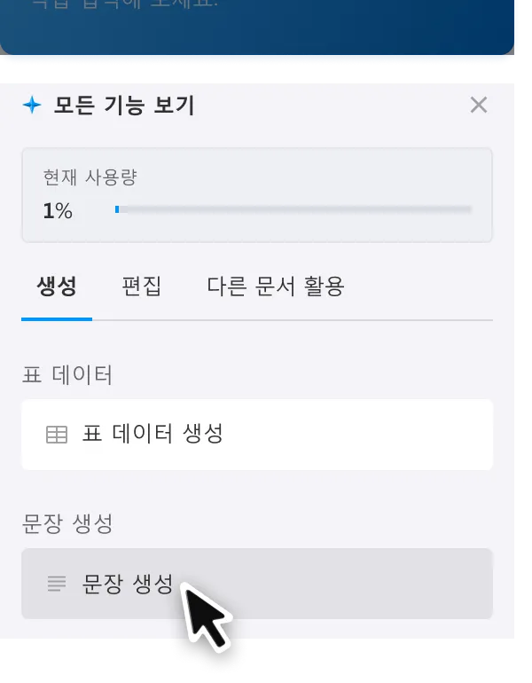 아래 3가지 방법으로 한컴독스 AI 문장 생성 기능을 이용할 수 있습니다.