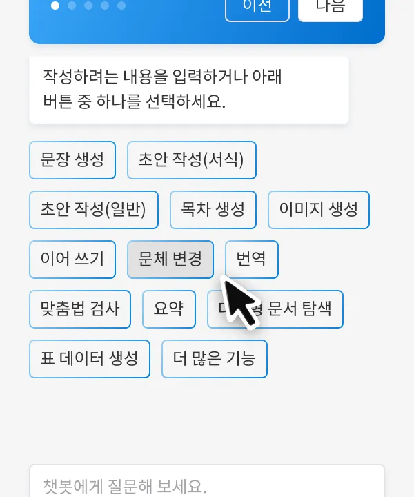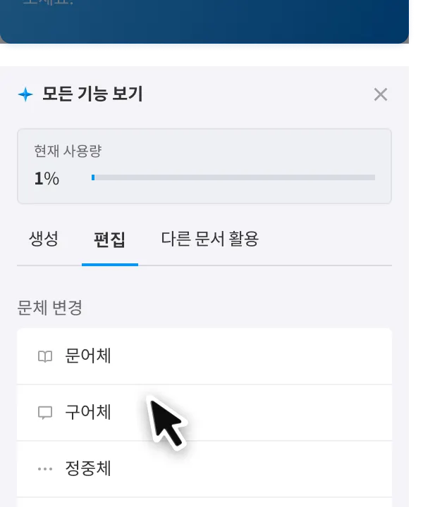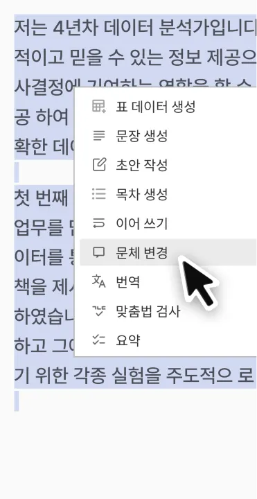 아래 3가지 방법으로 한컴독스 AI를 이용해 문체 변경 기능을 이용할 수 있습니다.