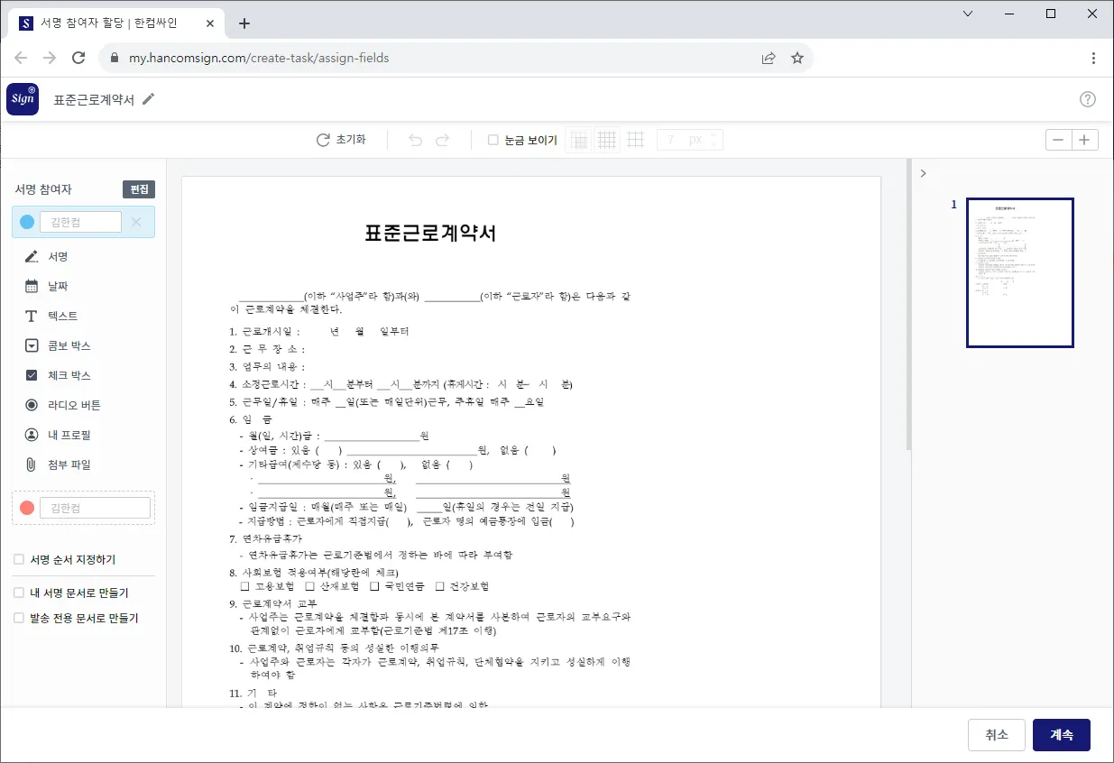 여기서 [취소] 버튼을 누르면, 한컴싸인 서비스 탭이 닫히고, 편집하던 문서를 수정할 수 있습니다.