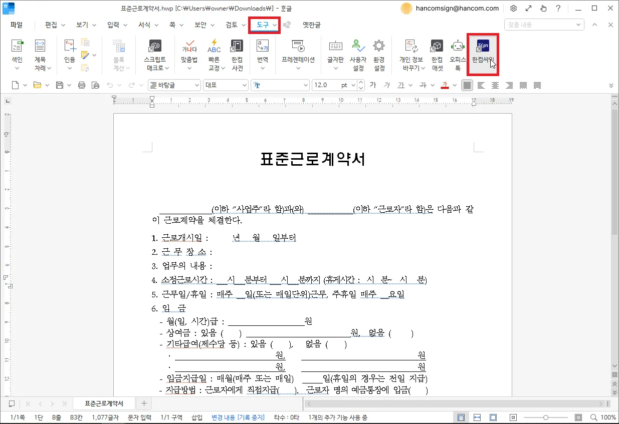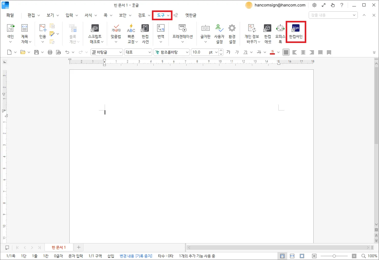 한글 2024를 재실행한 후, [도구] 탭에서 [한컴싸인] 기능이 추가된 것을 확인할 수 있습니다.
