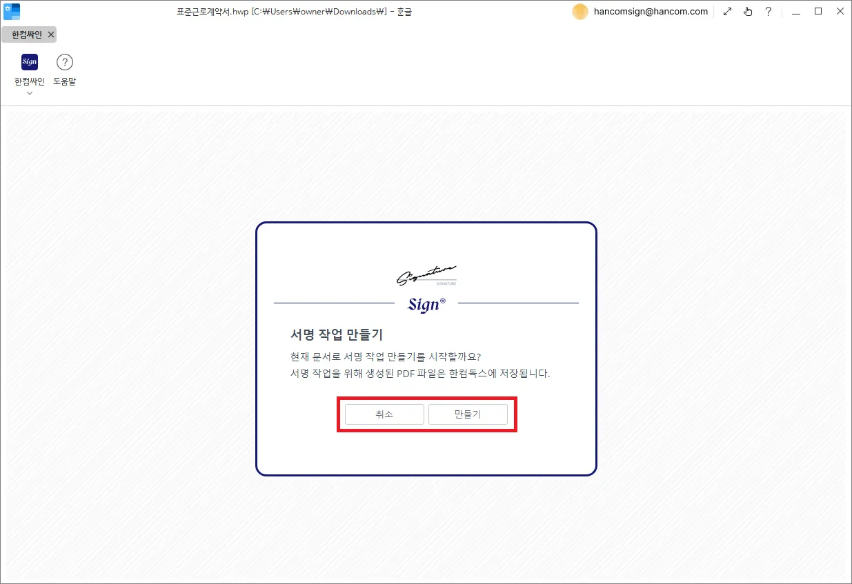 한컴싸인 서비스 탭(아래 화면)에서 [만들기] 버튼을 누르면 브라우저에 한컴싸인 서비스가 실행되고, 한글에서 편집한 문서가 [서명 작업 만들기] 화면으로 보여집니다.