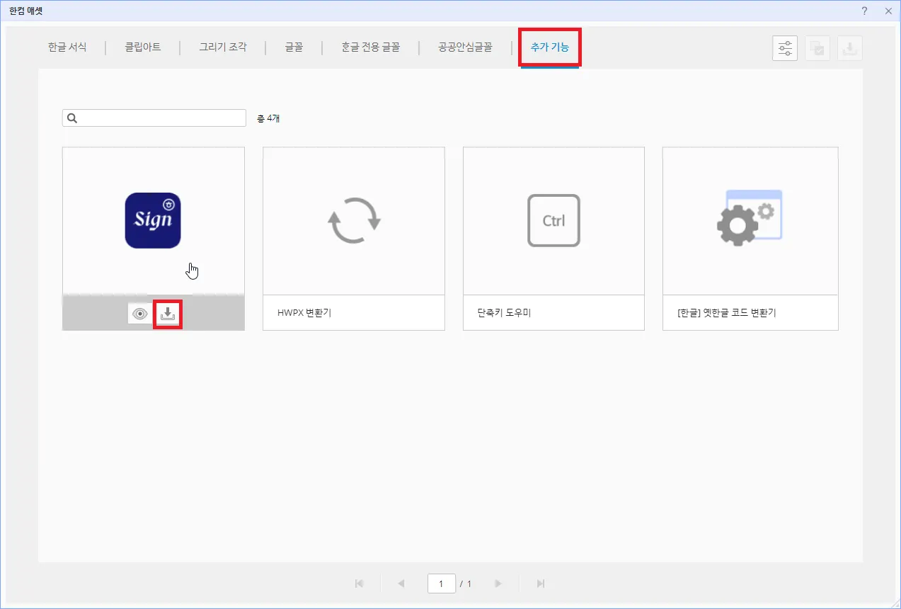 한글 2024의 [도구 > 한컴 애셋] 메뉴를 실행한 후, [추가 기능] 탭에서 다운로드 버튼을 눌러 한컴싸인 앱을 다운로드합니다.