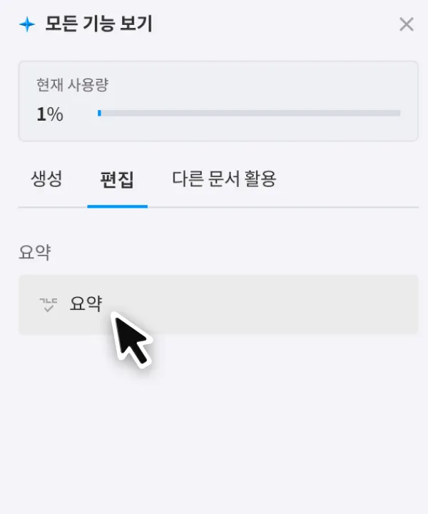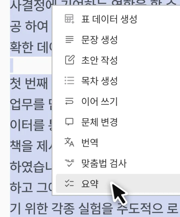 아래 4가지 방법으로 한컴독스 AI를 이용해 요약 기능을 이용할 수 있습니다.